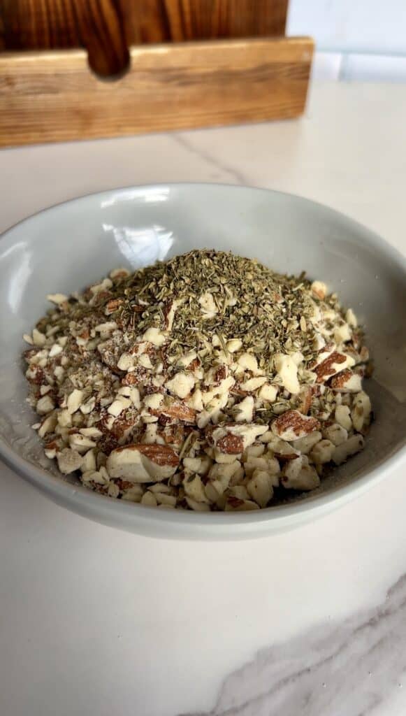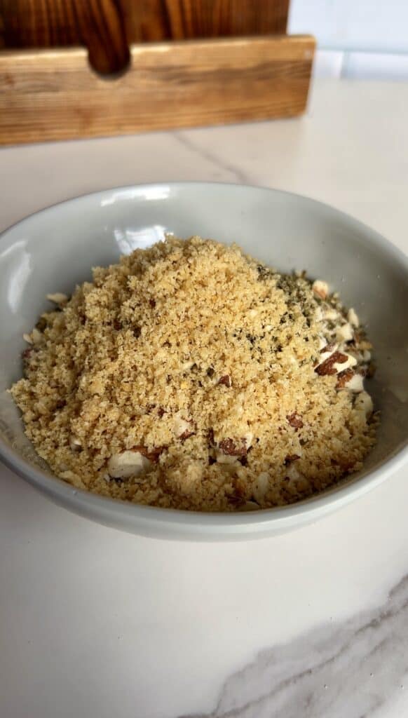 - Add processed almonds, seasoning, and bread crumbs to another bowl, whisking to combine