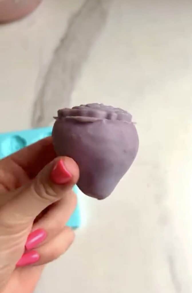 - Fill flower mold with more white chocolate and place your strawberry on top. Allow to harden in fridge or freezer
