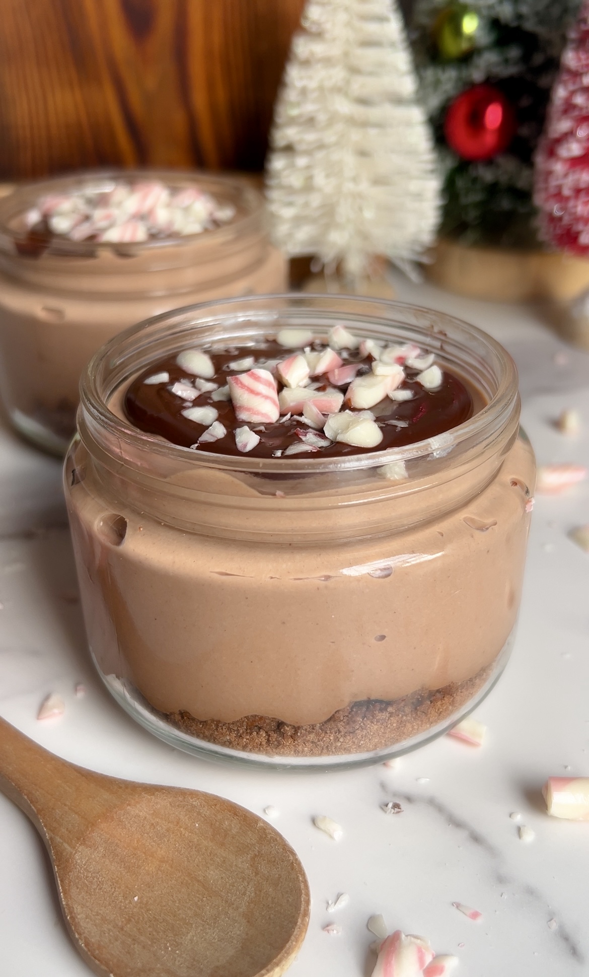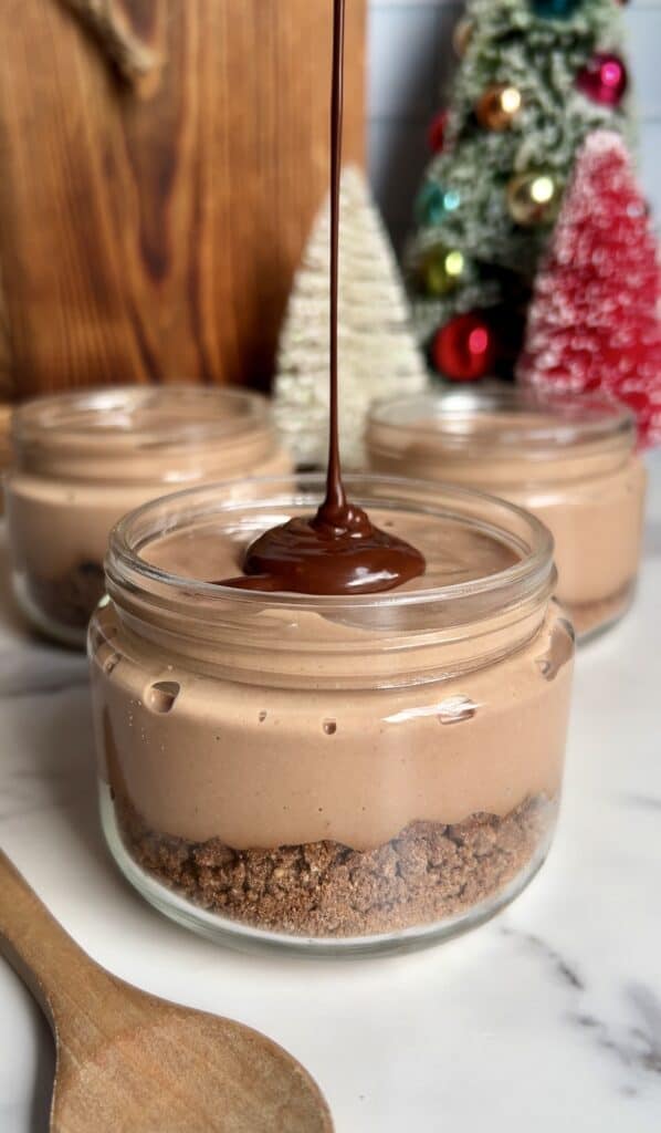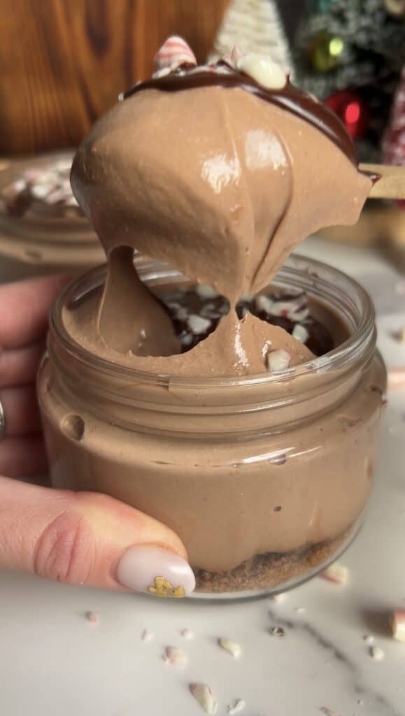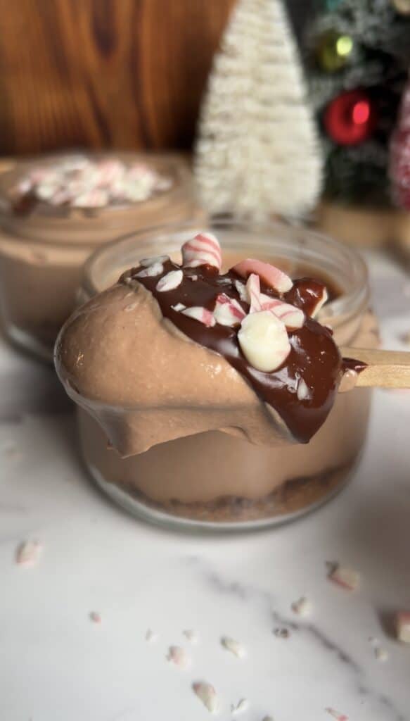 This Chocolate Peppermint Protein Mousse is incredibly thick and creamy, topped with a rich chocolate ganache coating, and crushed peppermint candies