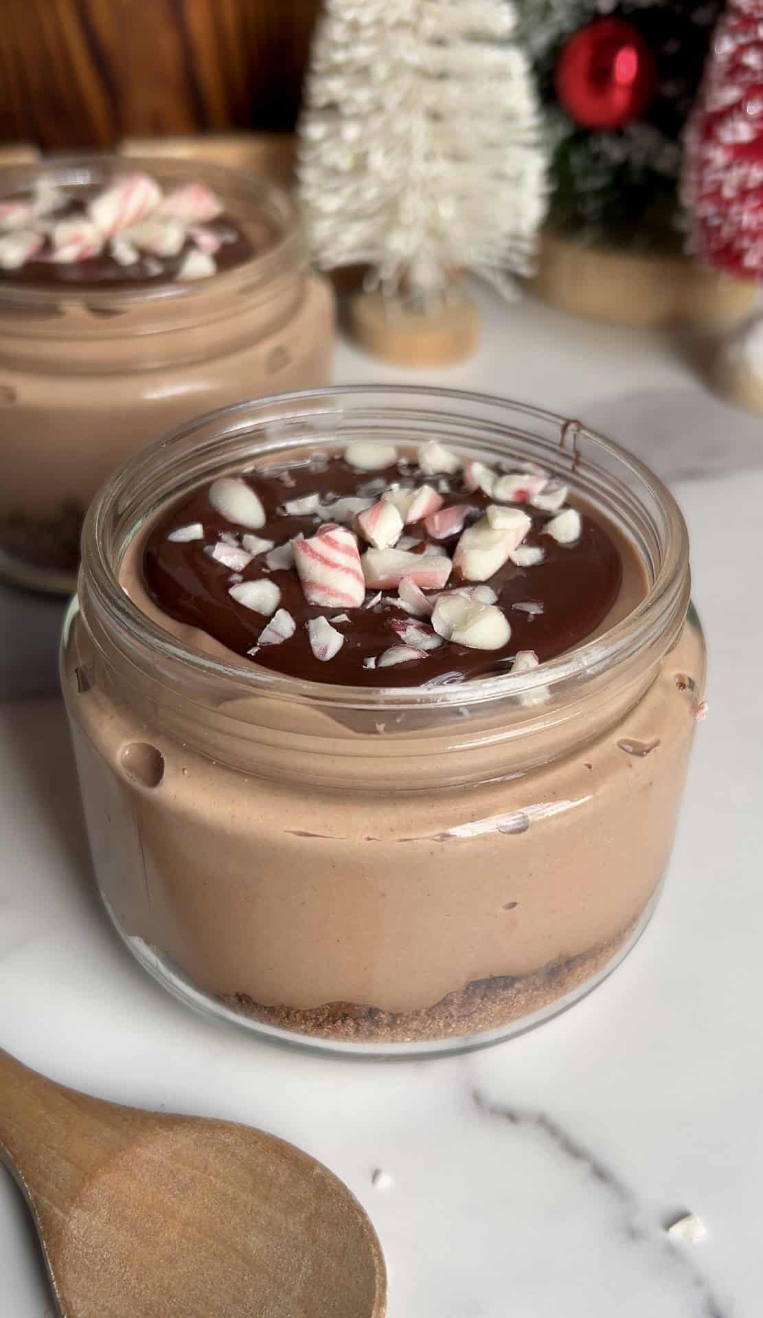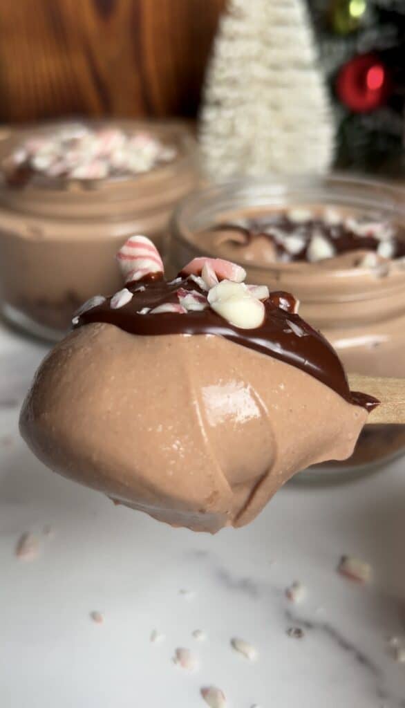 For the mousse itself I used Chocolate protein powder. You can add 1/2 tsp peppermint extract, or use chocolate peppermint protein powder, or save the peppermint for just the candy topping! Below are my favorite protein powder brands!
