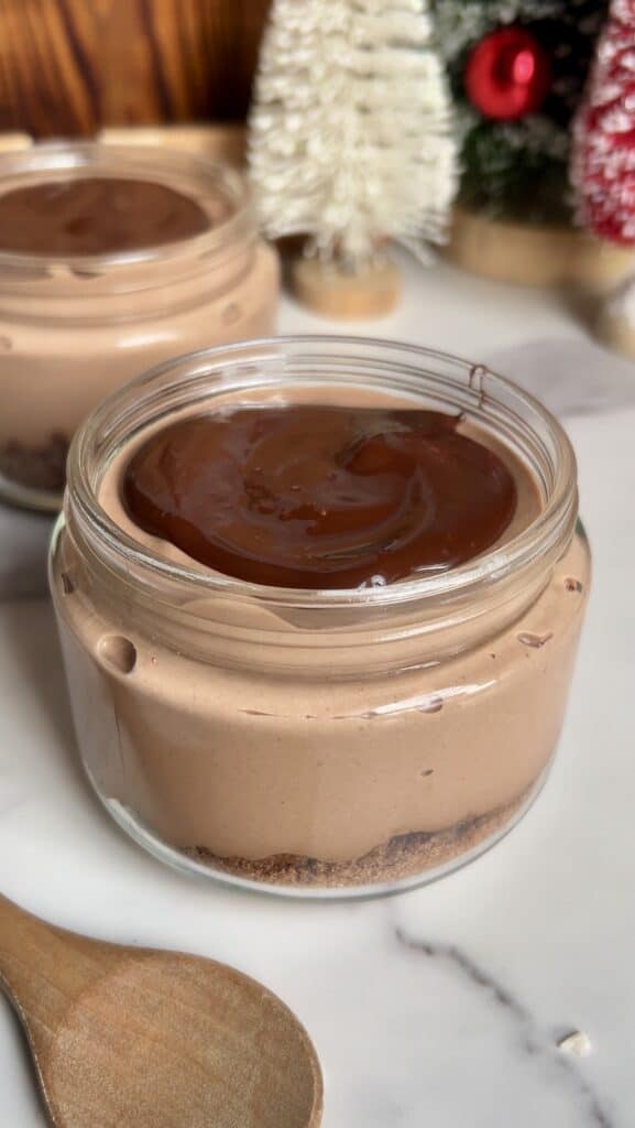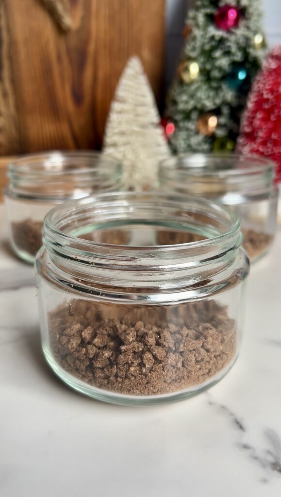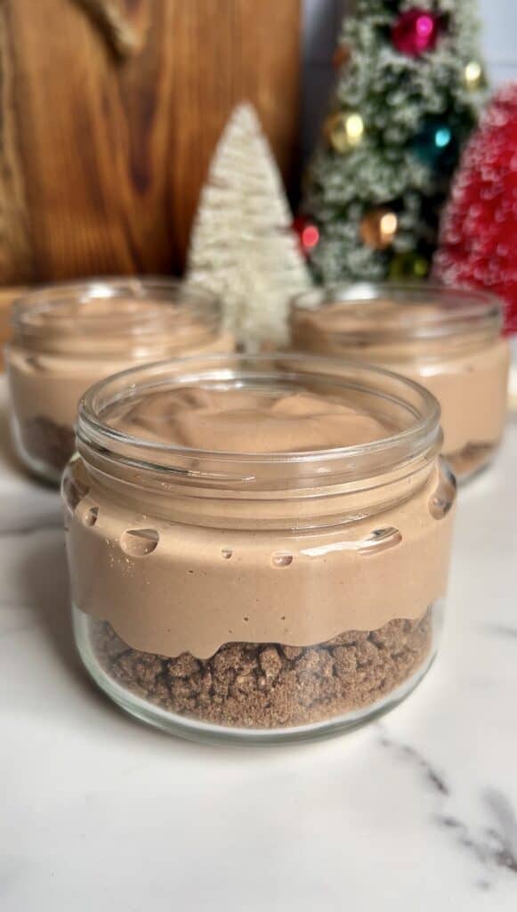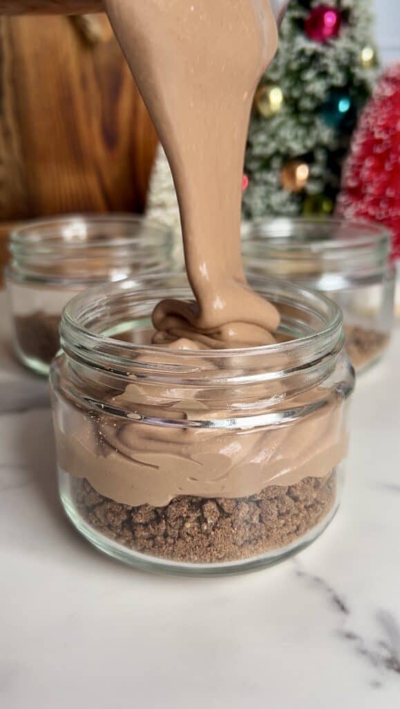 - Optionally, fill the bottoms of your storage jars (6oz I find work best) with crushed gluten free chocolate graham crackers (I like Simple Mills Brownie thins. They also come in mint chocolate!)