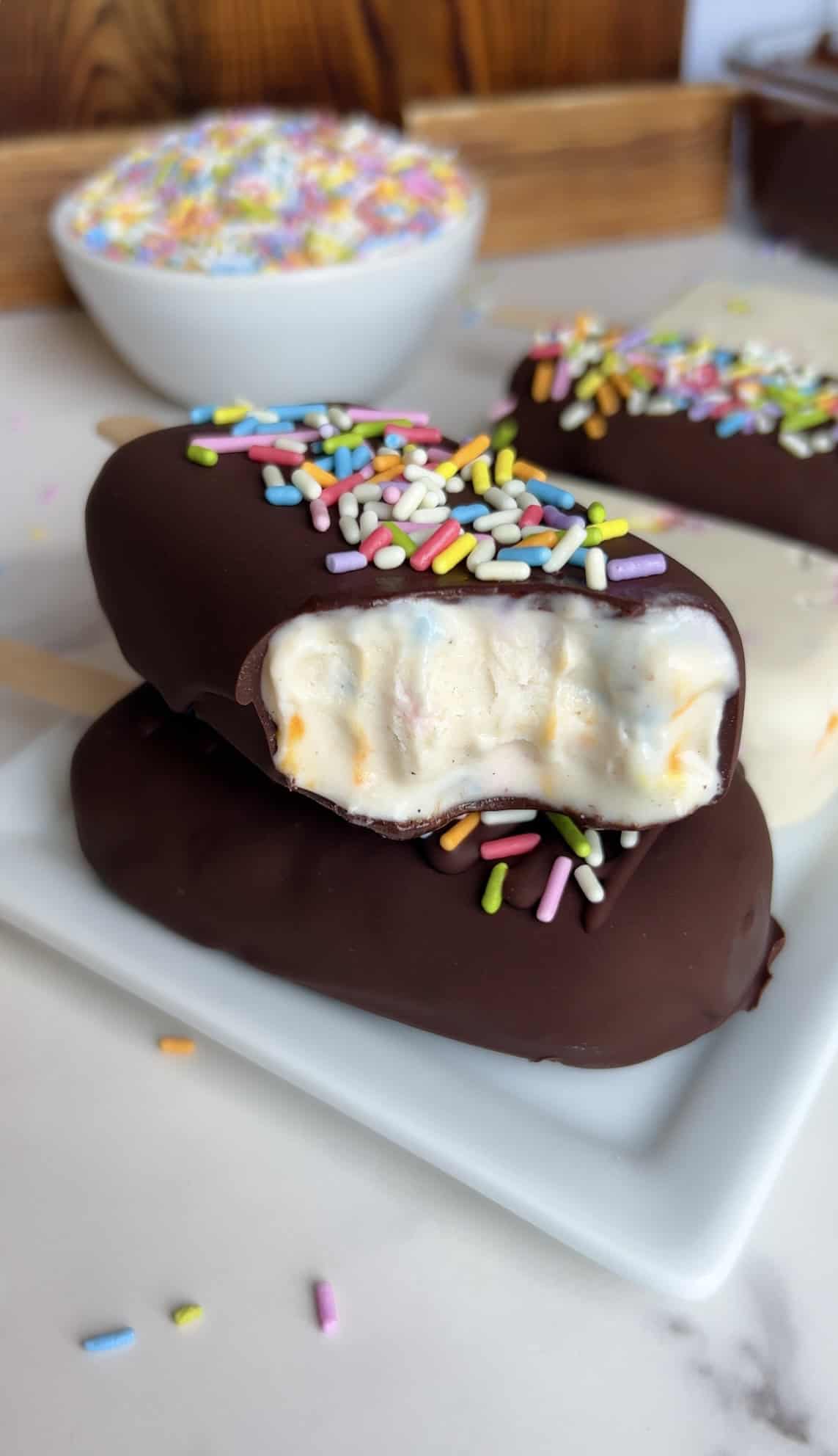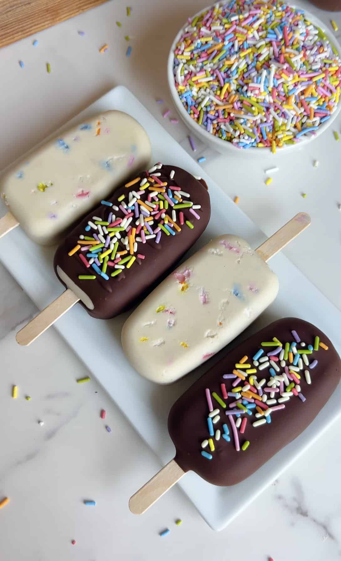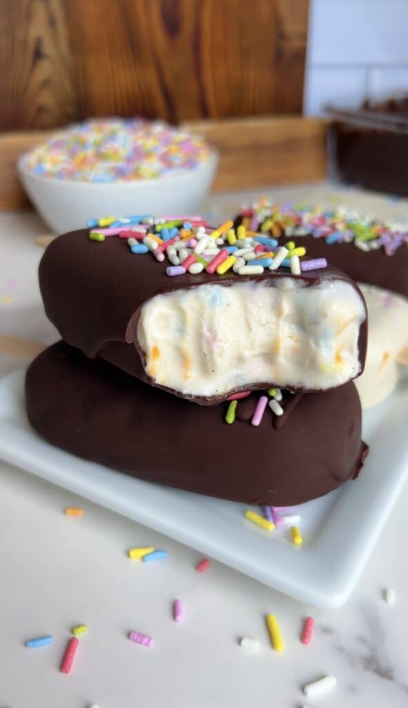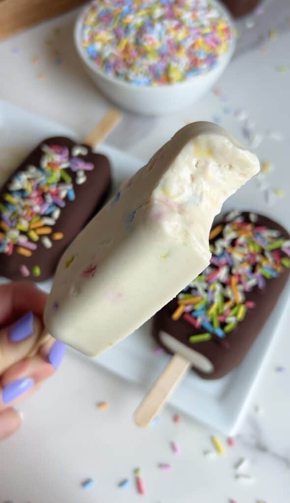Made with full-fat coconut milk, cashew butter, vanilla protein powder, and a sprinkle-studded swirl, they taste like a frozen birthday cake in popsicle form.