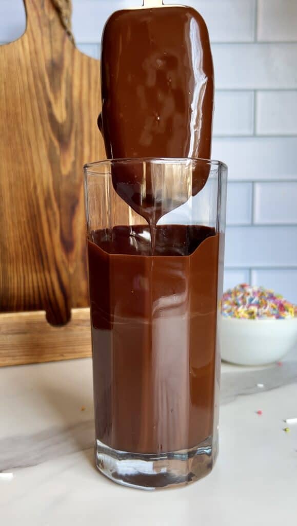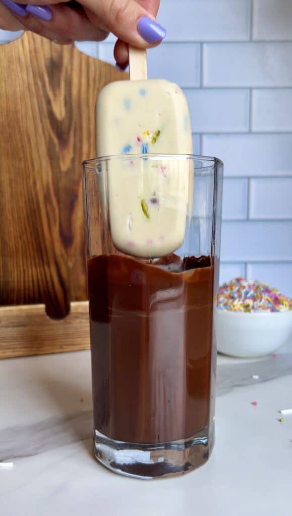 Make sure the popsicles are fully frozen before dipping, and use a tall glass so you can coat them quickly and evenly.