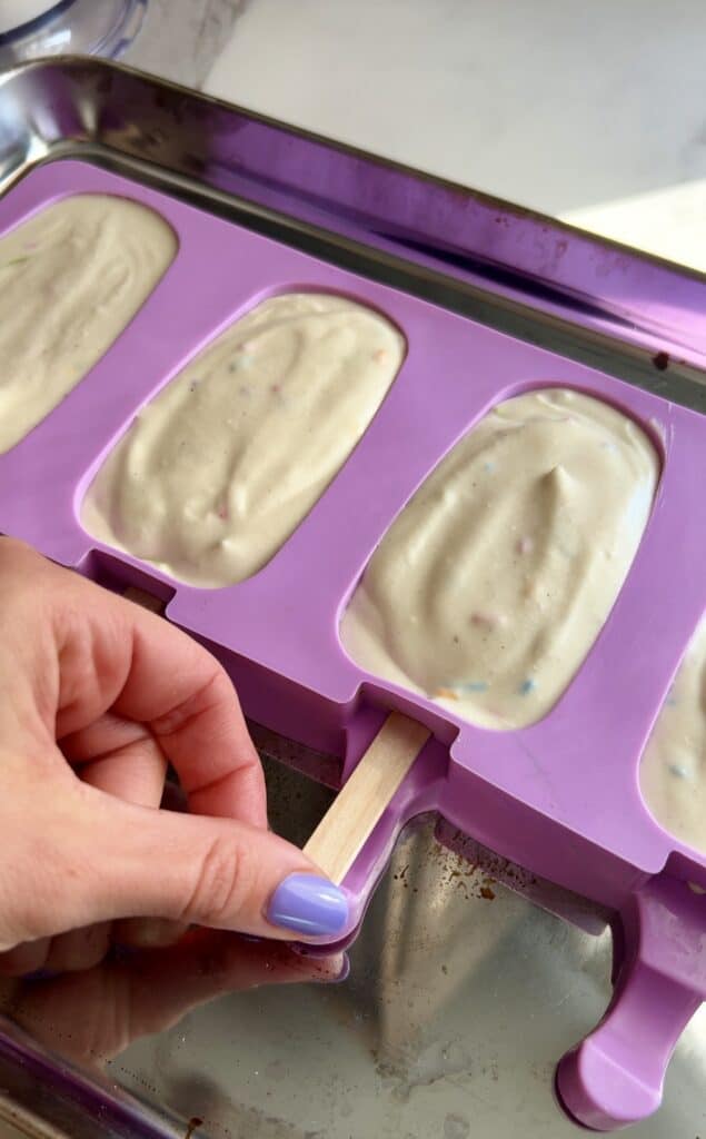 • Pour into popsicle molds, place your popsicle stick, and freeze at least 4 hours