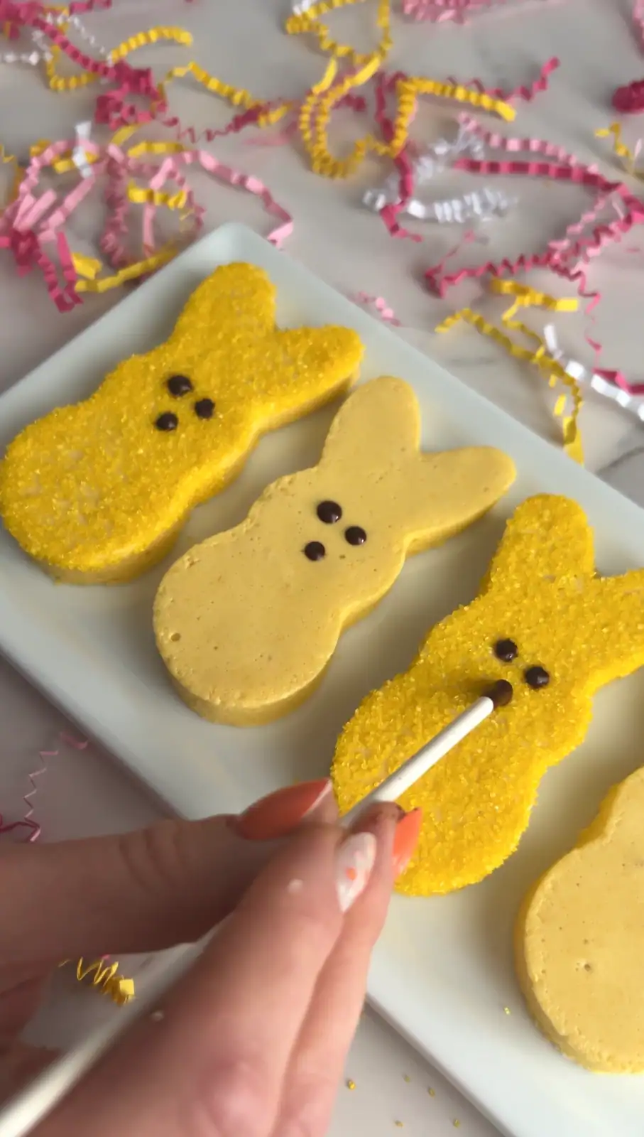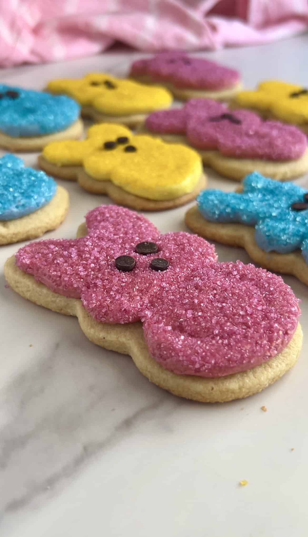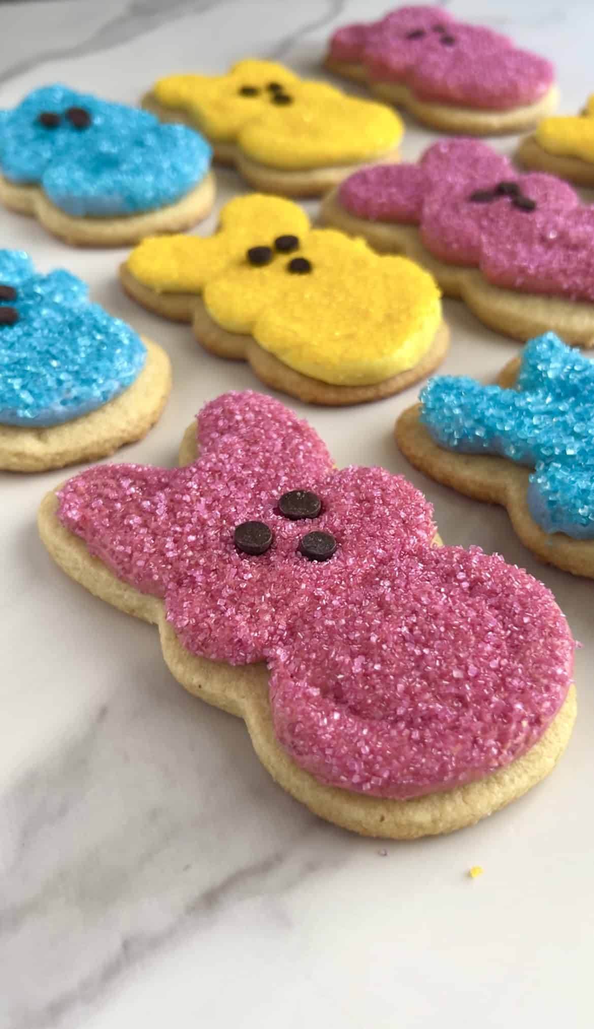 Each cookie gets dipped in naturally colored sanding sugar and finished with mini chocolate chip eyes for that iconic Peep look—fun, festive, and totally dye‑free.