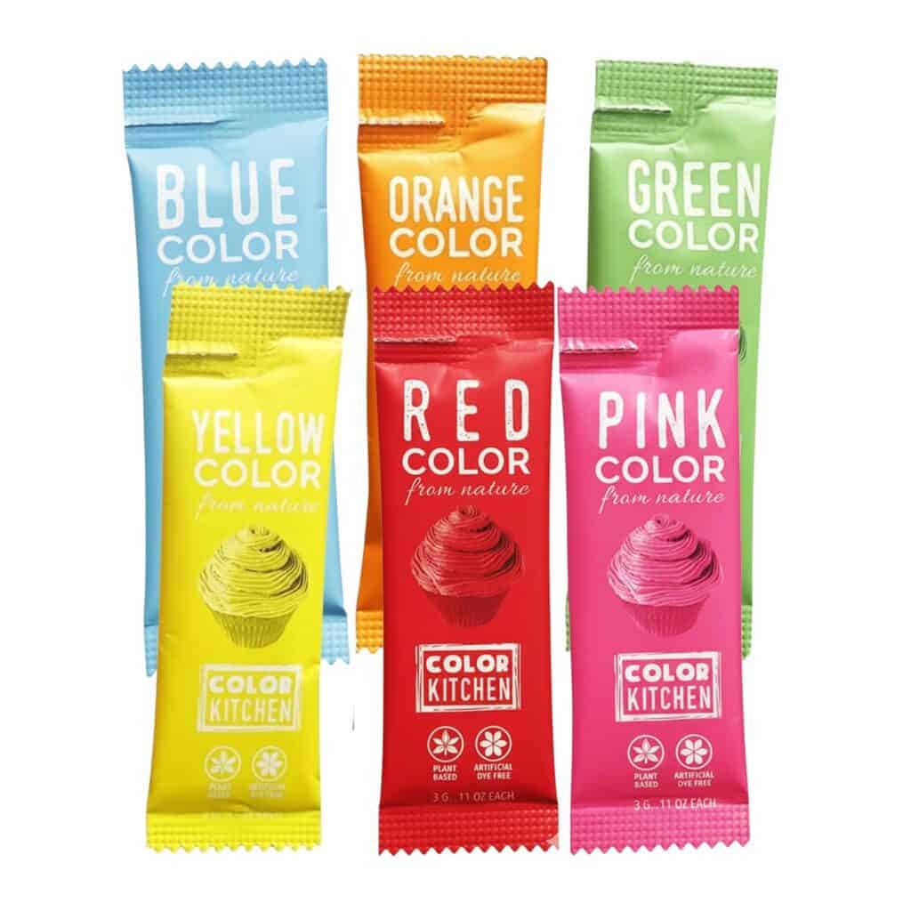 Color Kitchen Foods packets create vibrant pink, yellow, and blue shades without artificial dyes. They blend easily into frosting and sprinkles.