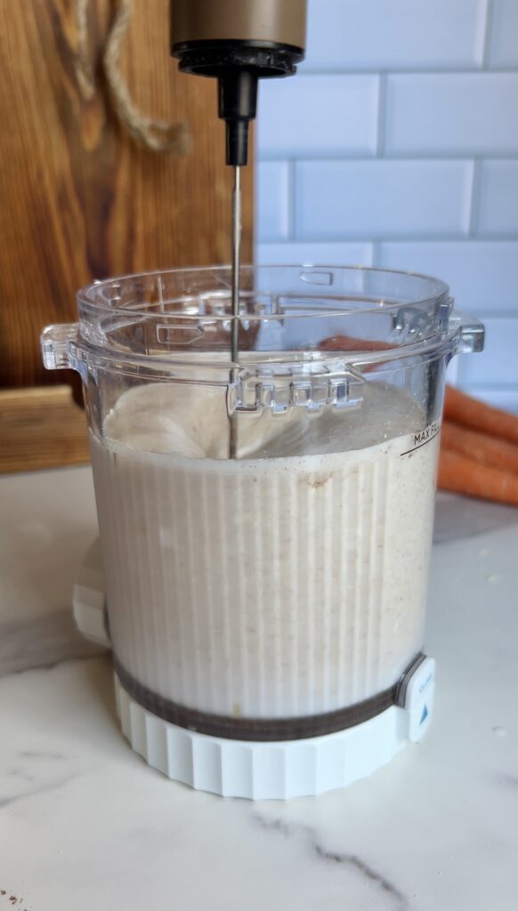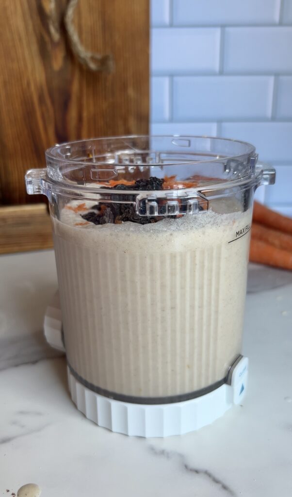 Add all base ingredients — coconut milk (use full fat here for ultra creaminess), vanilla protein powder, collagen, maple syrup, vanilla, shredded carrots, and spices — to a blender. Blend until completely smooth and creamy.