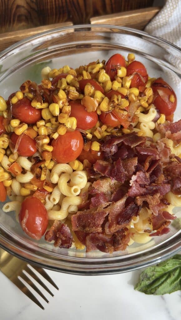 Charred corn, blistered cherry tomatoes, red onion, and red bell pepper add smoky depth and vibrant color, while crispy bacon brings the perfect salty crunch.