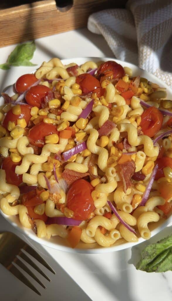Made with gluten‑free chickpea pasta, charred corn, blistered cherry tomatoes, and crisp bacon, this pasta salad delivers bold color and big flavor in every bite.