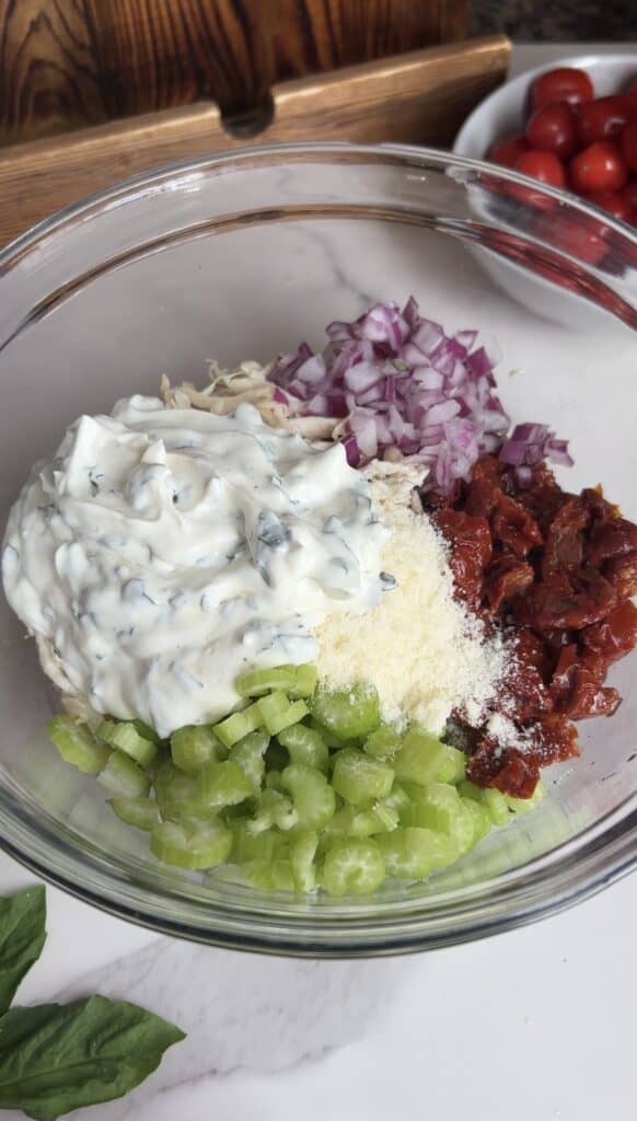 - Add chicken, celery, onion, cucumber, sun-dried tomatoes, and parmasean in a large bowl