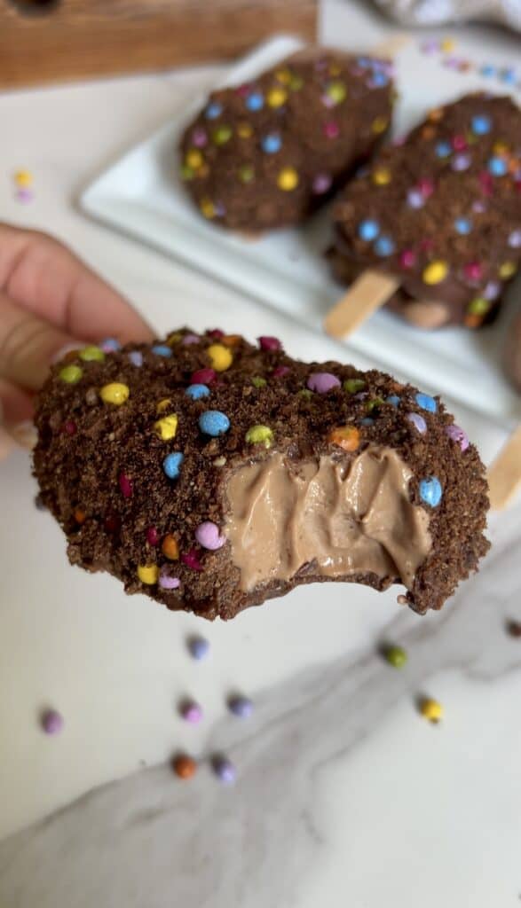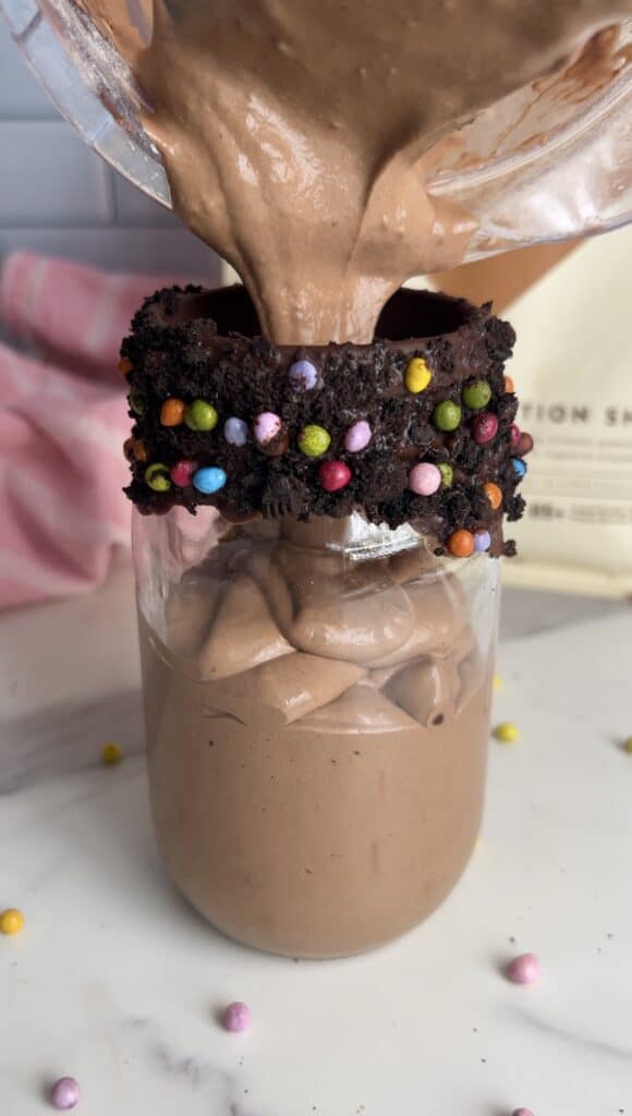 With a thick and creamy chocolate shake base, mini brownie bits throughout, complimented with dark chocolate and those iconic mini colorful gems!