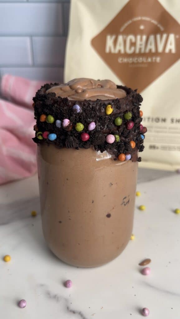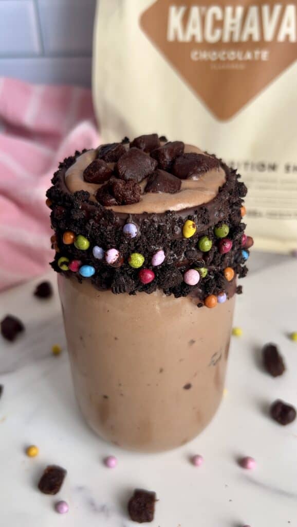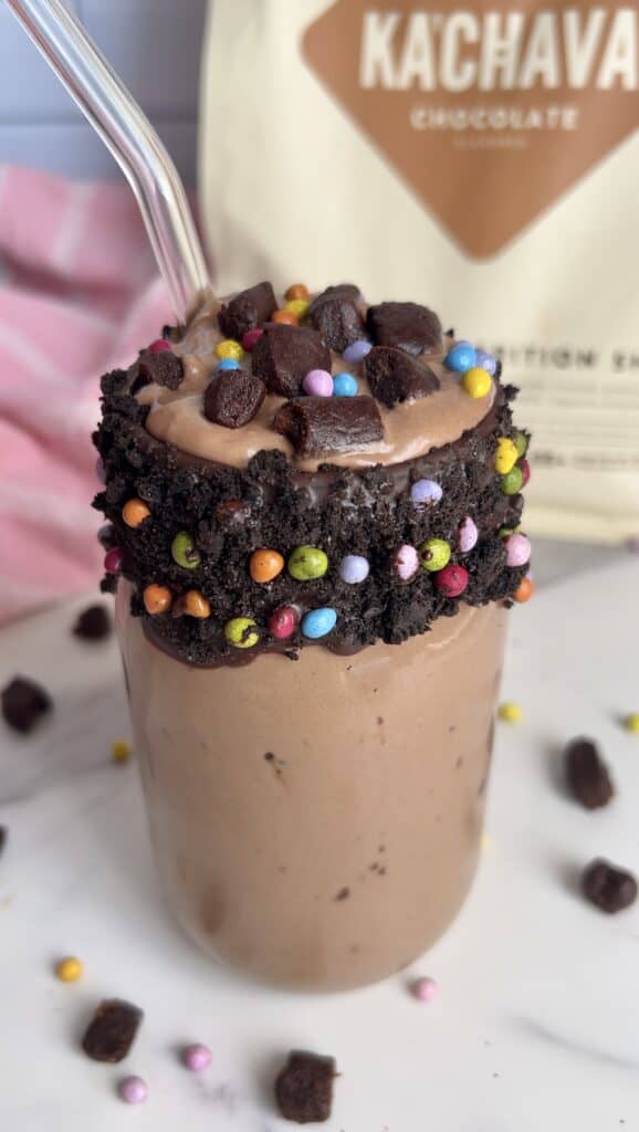 - 2 scoops @KaChava Chocolate all-in-one protein or roughly 1/3 cup chocolate protein of choice
