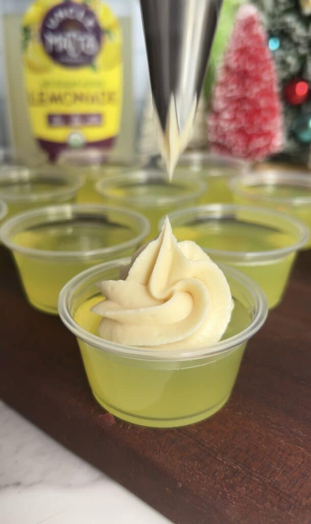 • Once whipped, place in a piping bag (you will have extra), pipe overtop jello cups