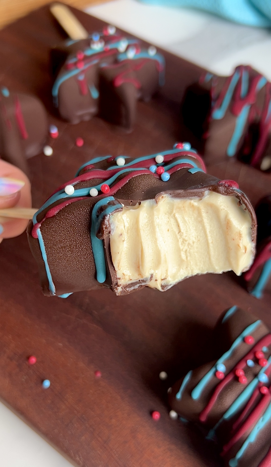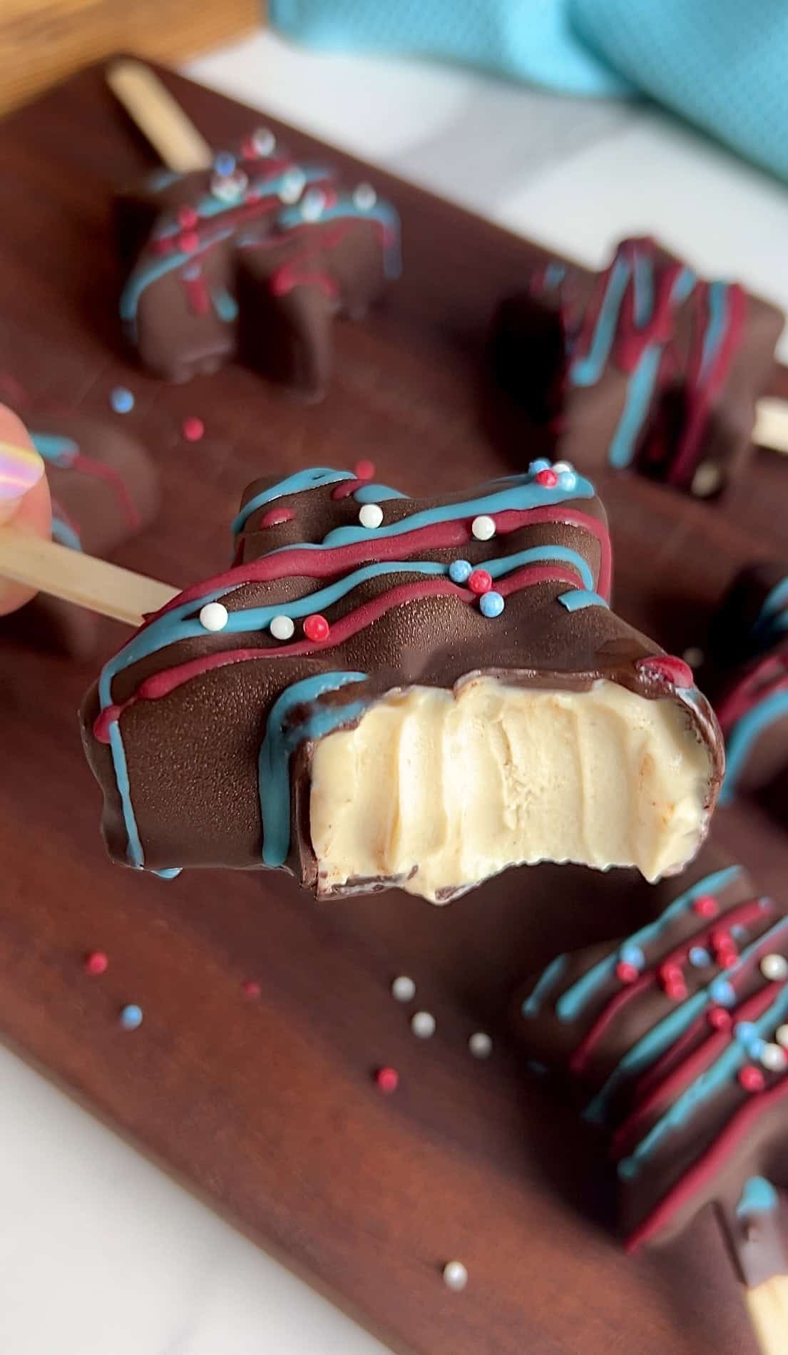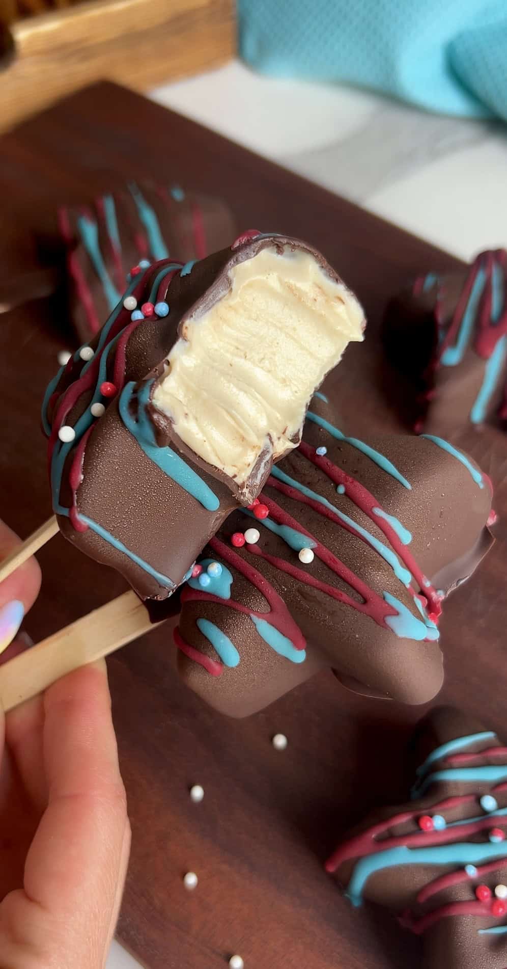 These high‑protein ice cream stars are the ultimate warm‑weather treat — creamy, chocolate‑dipped, and decorated with naturally colored red and blue chocolate for a festive, patriotic finish.