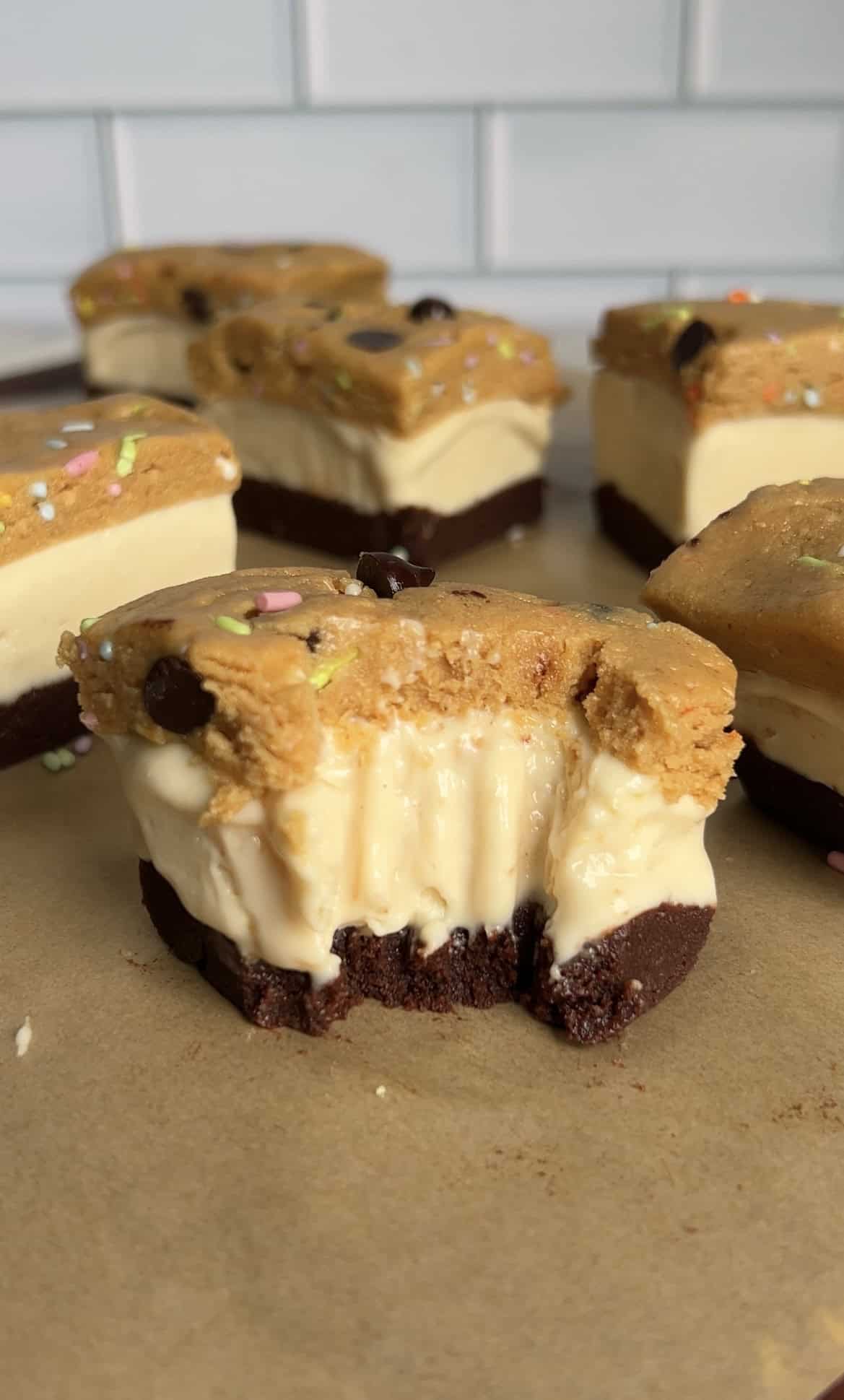 Last summer I made a Brownie Dough Ice Cream Cookie Sandwich, but the added cookie dough layer and the protein boost to the ice cream makes them next level!