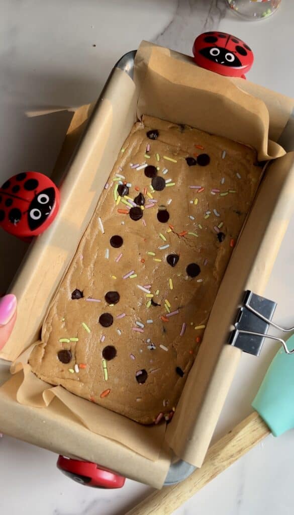 Mix your cookie dough ingredients together until smooth, then fold in chocolate chips and sprinkles