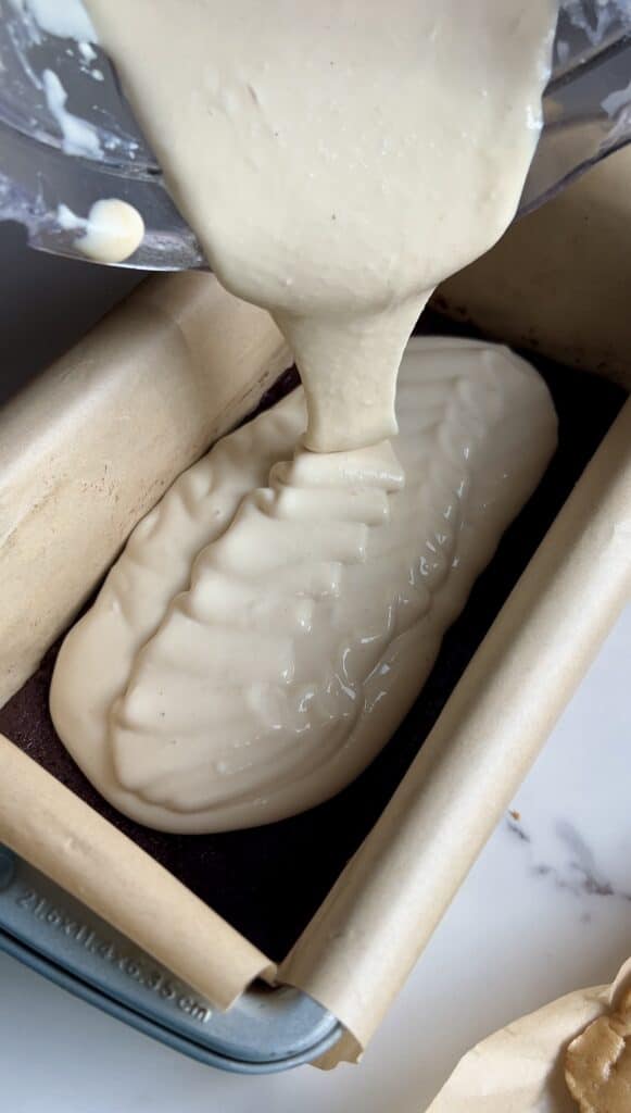 - Mix brownie dough ingredients together, then press down into the bottom of the loaf tin