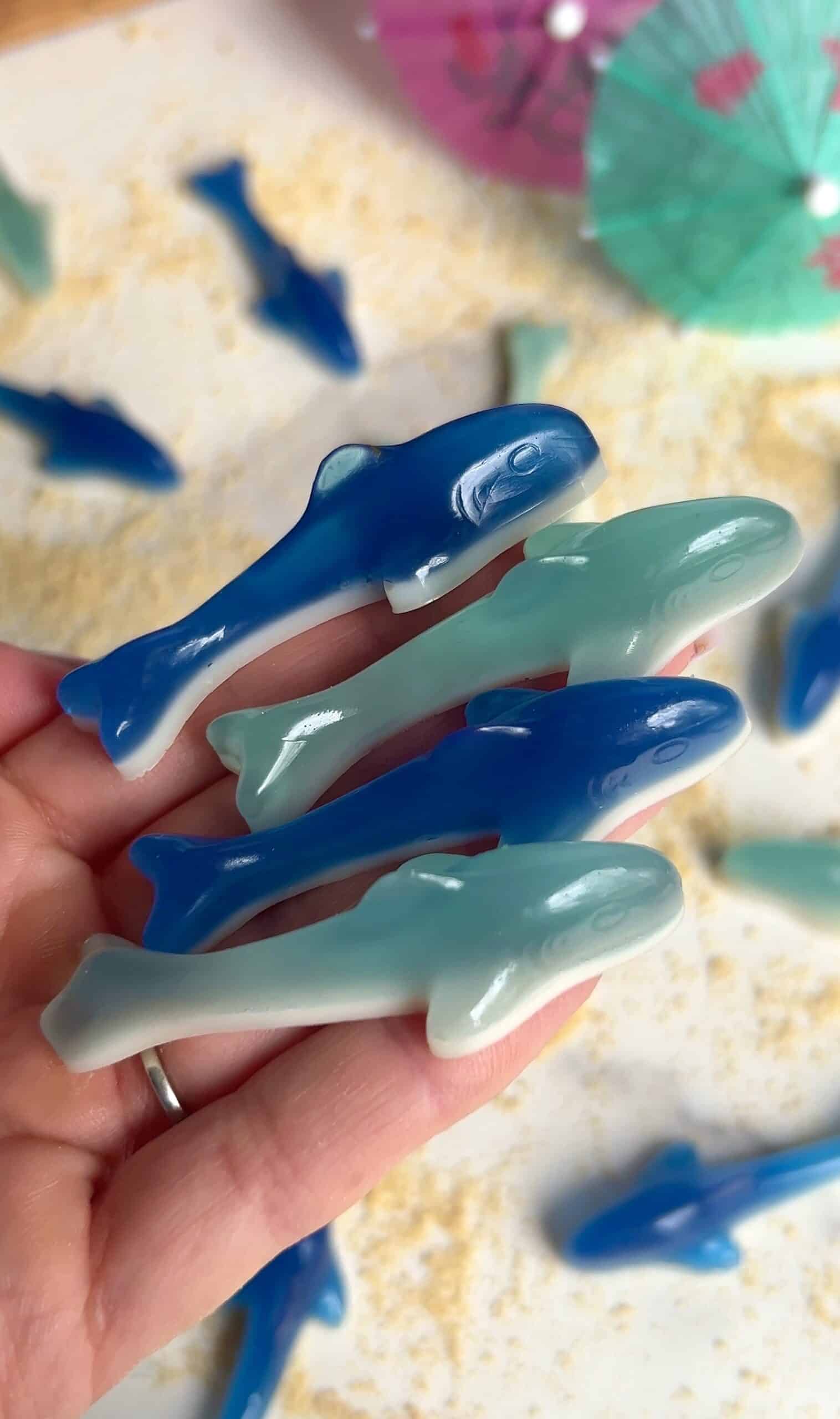 The creamy white underside is made with coconut milk, honey, and gelatin, giving each gummy the classic two‑tone shark look.