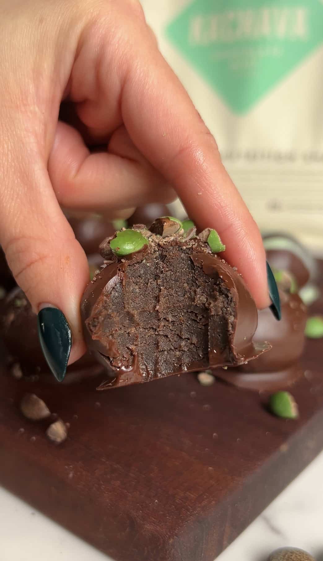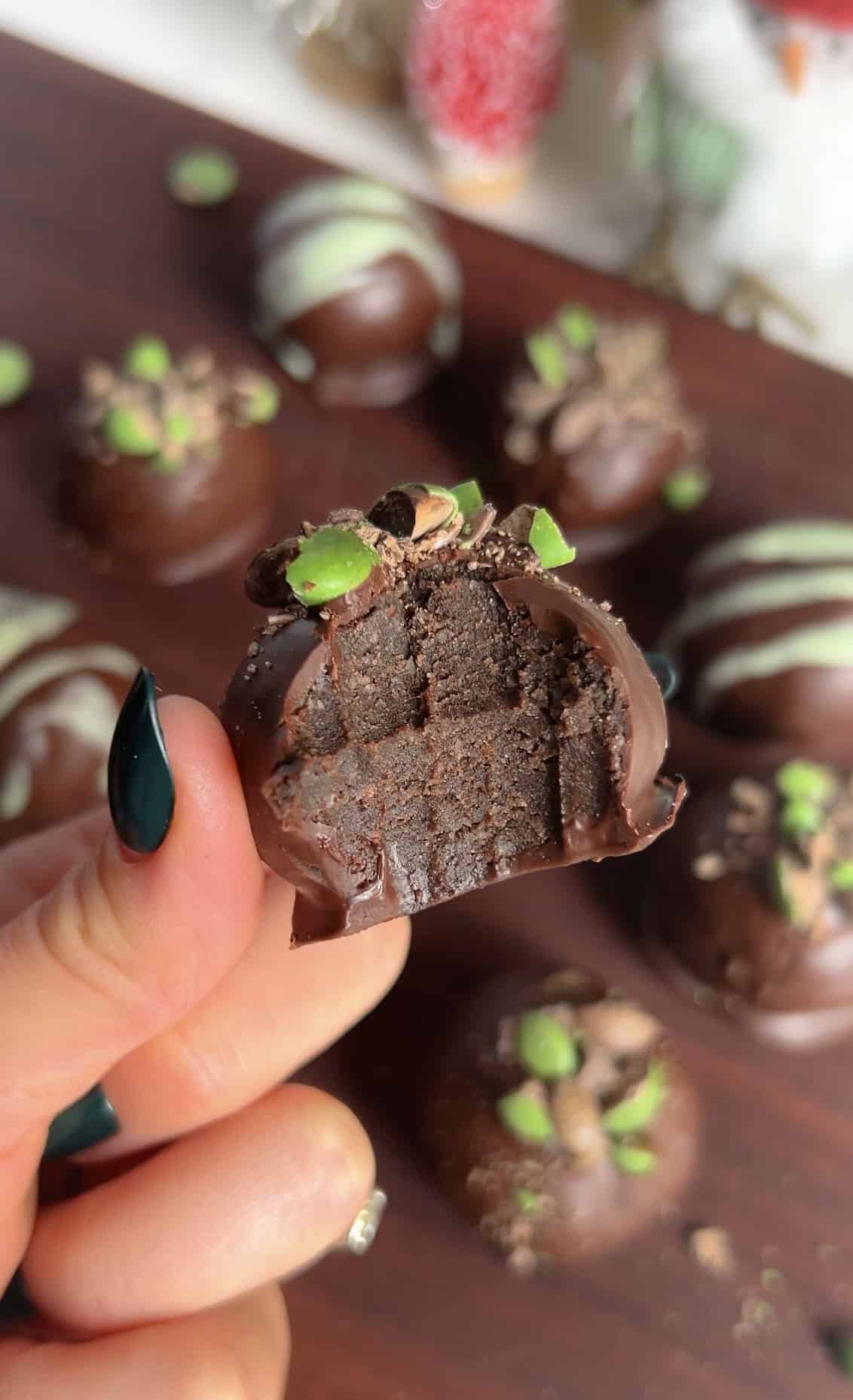 These Mint Brownie Protein Truffles have that melt in your mouth brownie dough texture, then perfectly wrapped in rich dark chocolate.