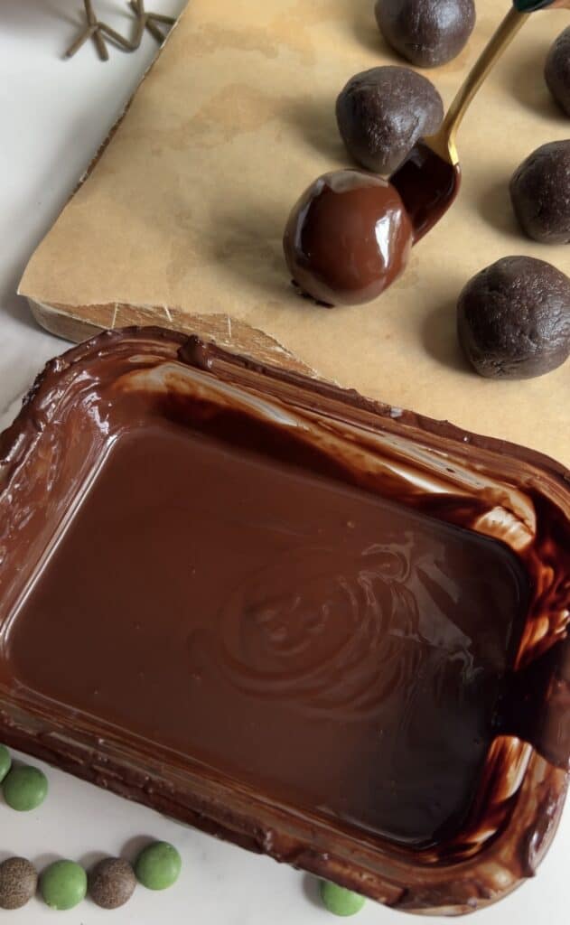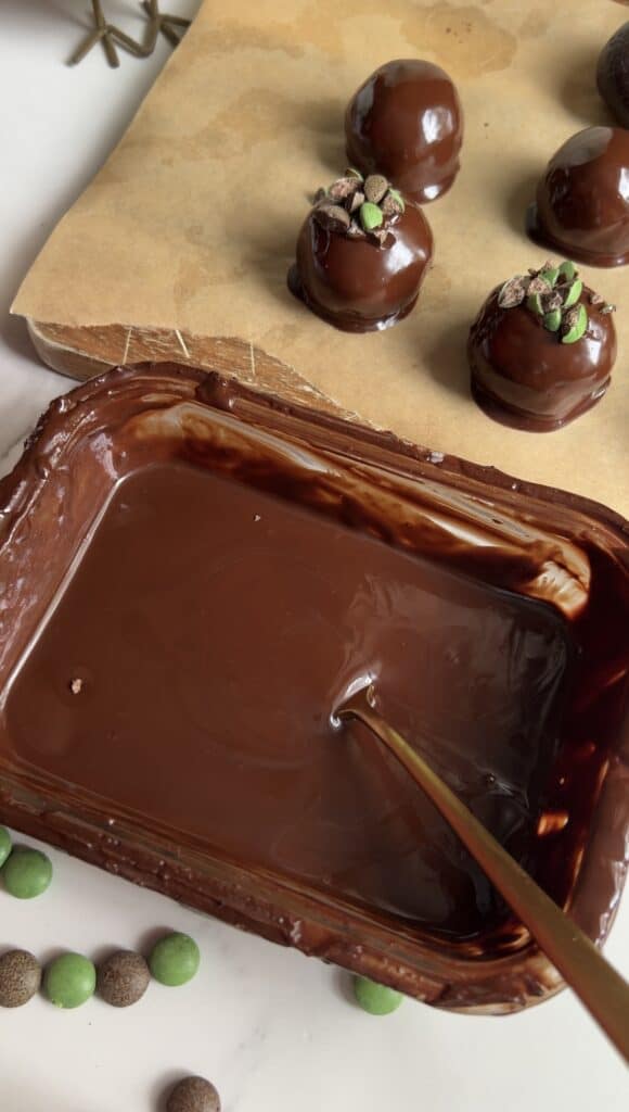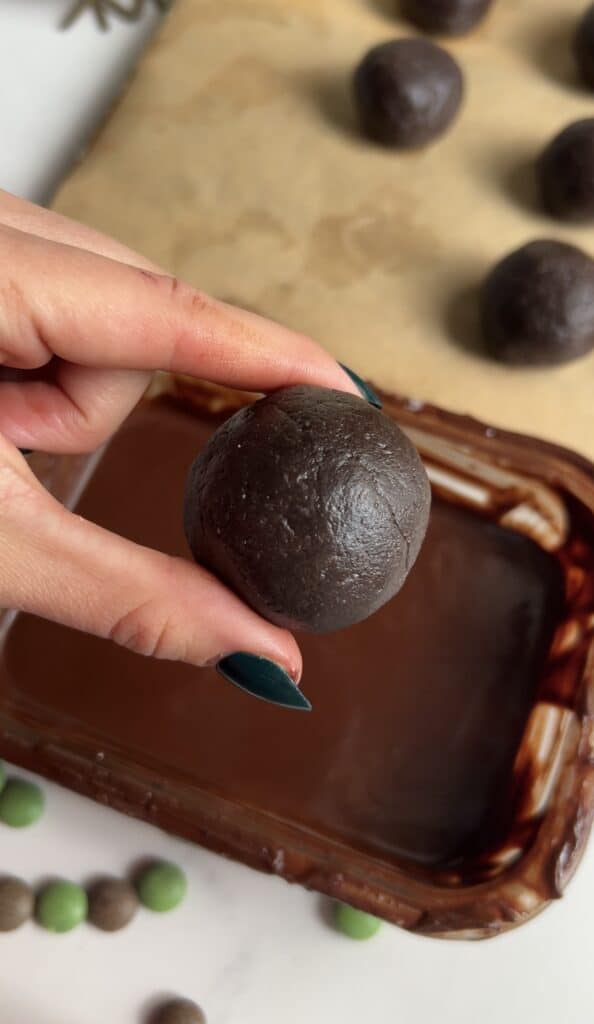 • Use a fork to dip each brownie batter ball into the chocolate, allow the excess to drip off, and place on parchment paper