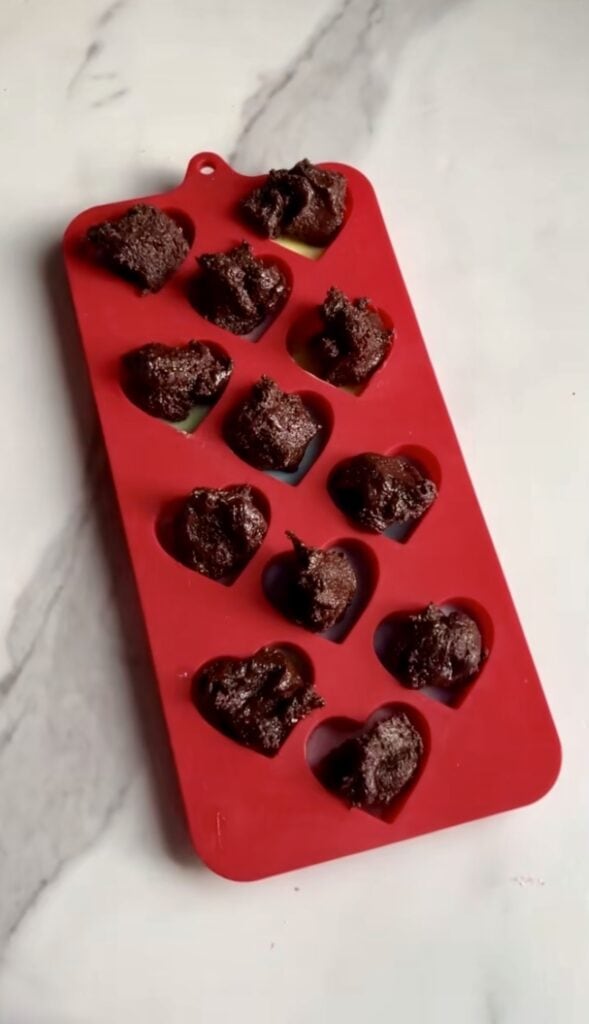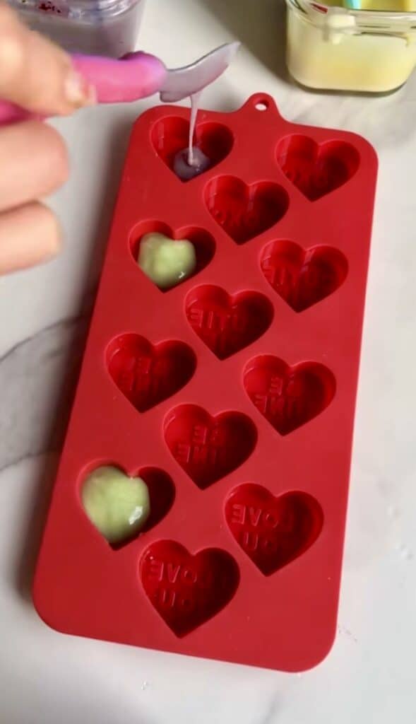 - Pour into candy heart mold and freeze until hard. This will only take a few min