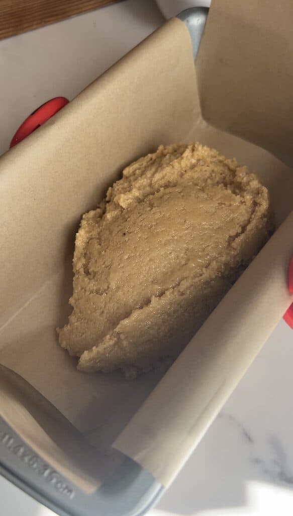 - Add the almond flour and protein powder, mixing until a soft dough forms. Press the dough evenly into a parchment‑lined 8×8 or loaf pan.