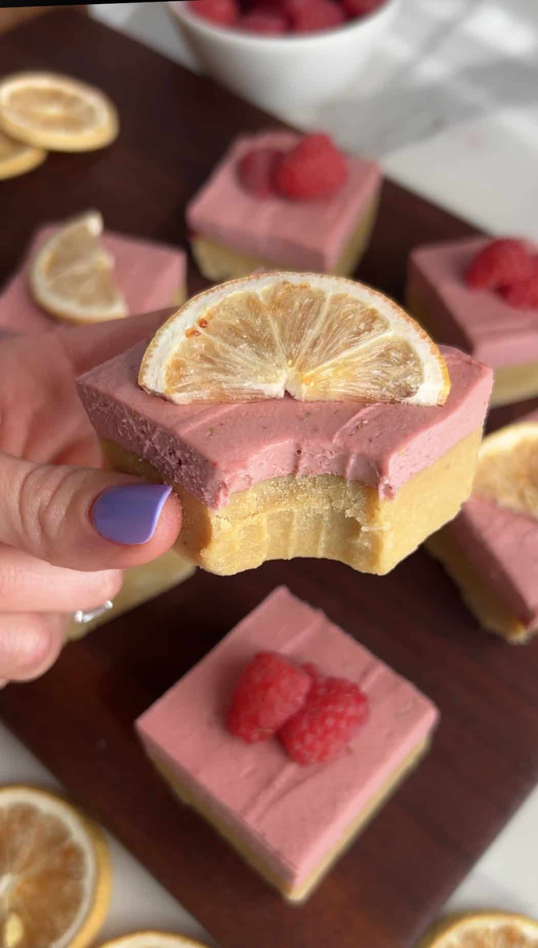 Then it’s topped with a luscious raspberry‑lemon protein frosting that’s tangy, vibrant, and packed with flavor thanks to freeze‑dried raspberries.