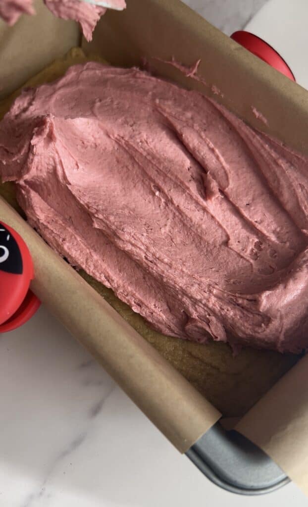 - Make the frosting: Beat the softened cream cheese with protein powder, raspberry powder, lemon juice, and powdered sugar until thick, creamy, and bright pink.