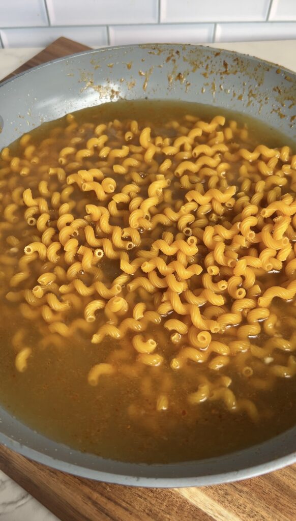 • Simmer uncovered over med-high heat until pasta is al dente (2 minutes less than your boxed pasta calls for), stirring regularly