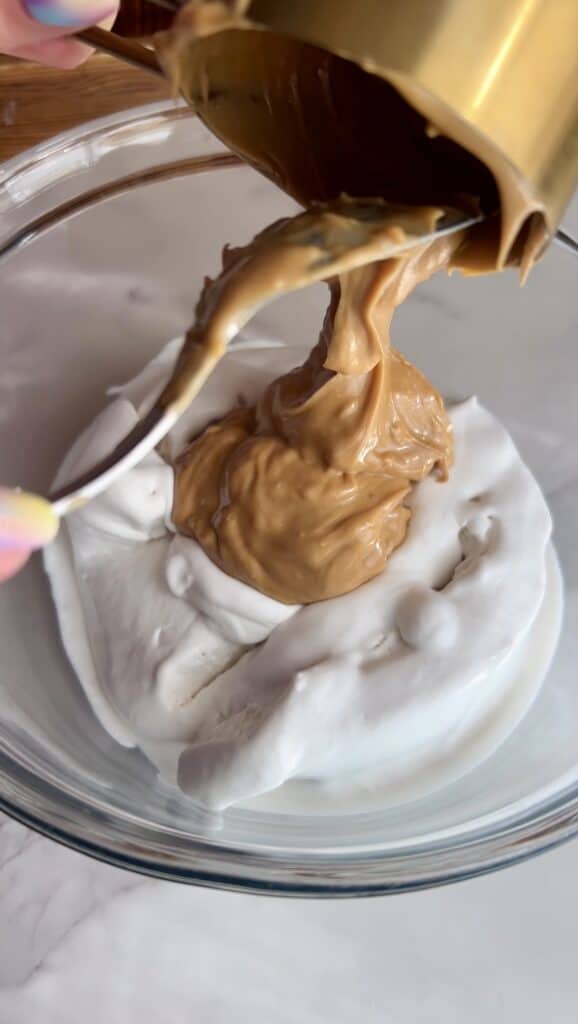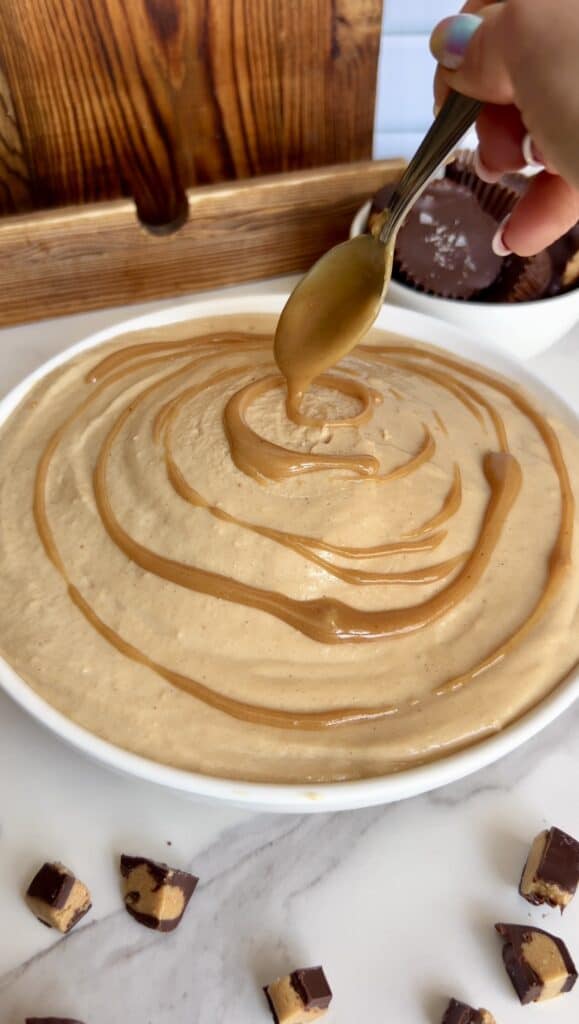 The base is made with coconut whipped topping, peanut butter, blended cottage cheese, and vanilla protein powder—giving you a rich, creamy texture with a boost of protein.