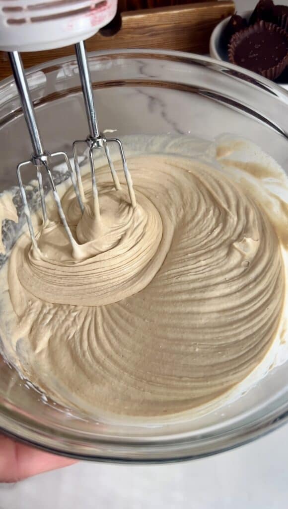 Sprinkle in the vanilla protein powder and PB powder and mix on low for 5–10 seconds, then finish by folding with a spatula to keep the mixture airy.