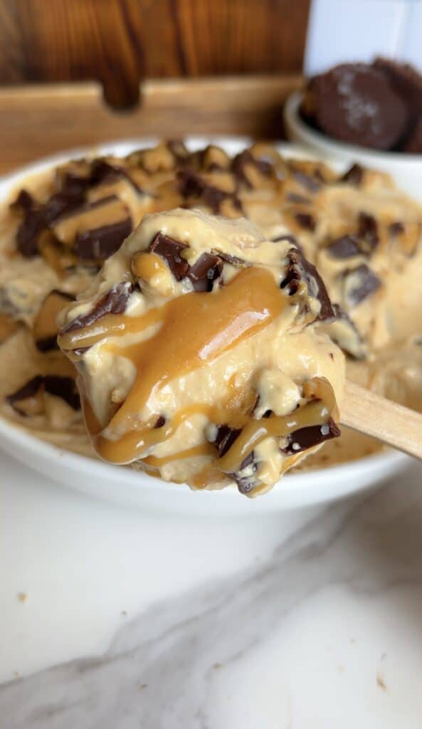 It has all the nostalgic flavors of a peanut butter cup, the chilled creaminess of a frozen mousse, and the thick, spoonable texture people love in a high‑protein yogurt dip—but without any complicated steps.
