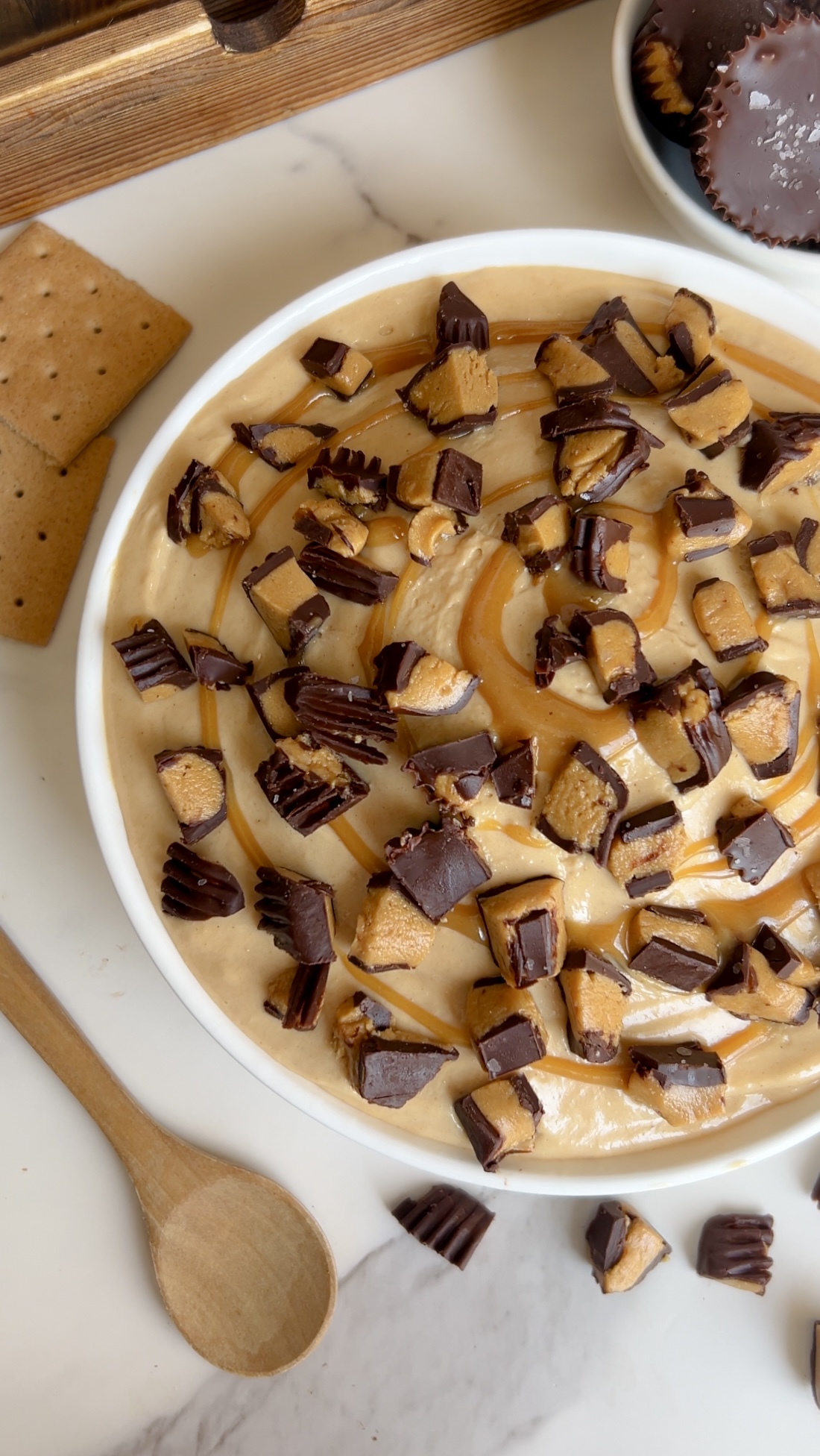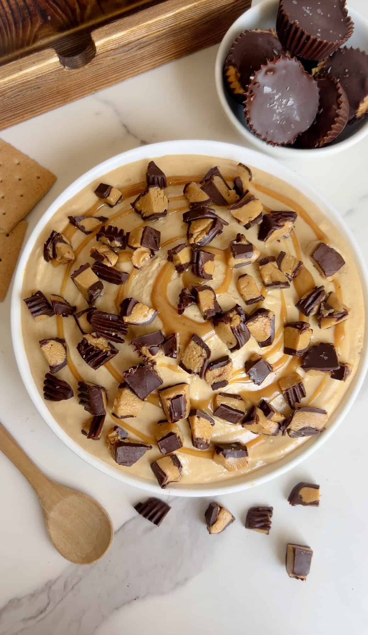 • Top with chopped peanut butter cups and a drizzle of melted peanut butter.