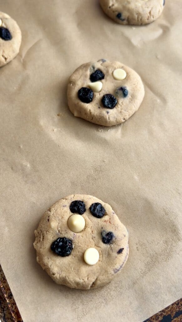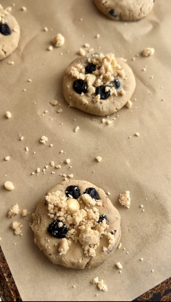 Fold in crushed freeze‑dried blueberries or white chocolate chips for extra bakery vibes, then top each cookie with a simple crumble for that classic muffin‑top texture.