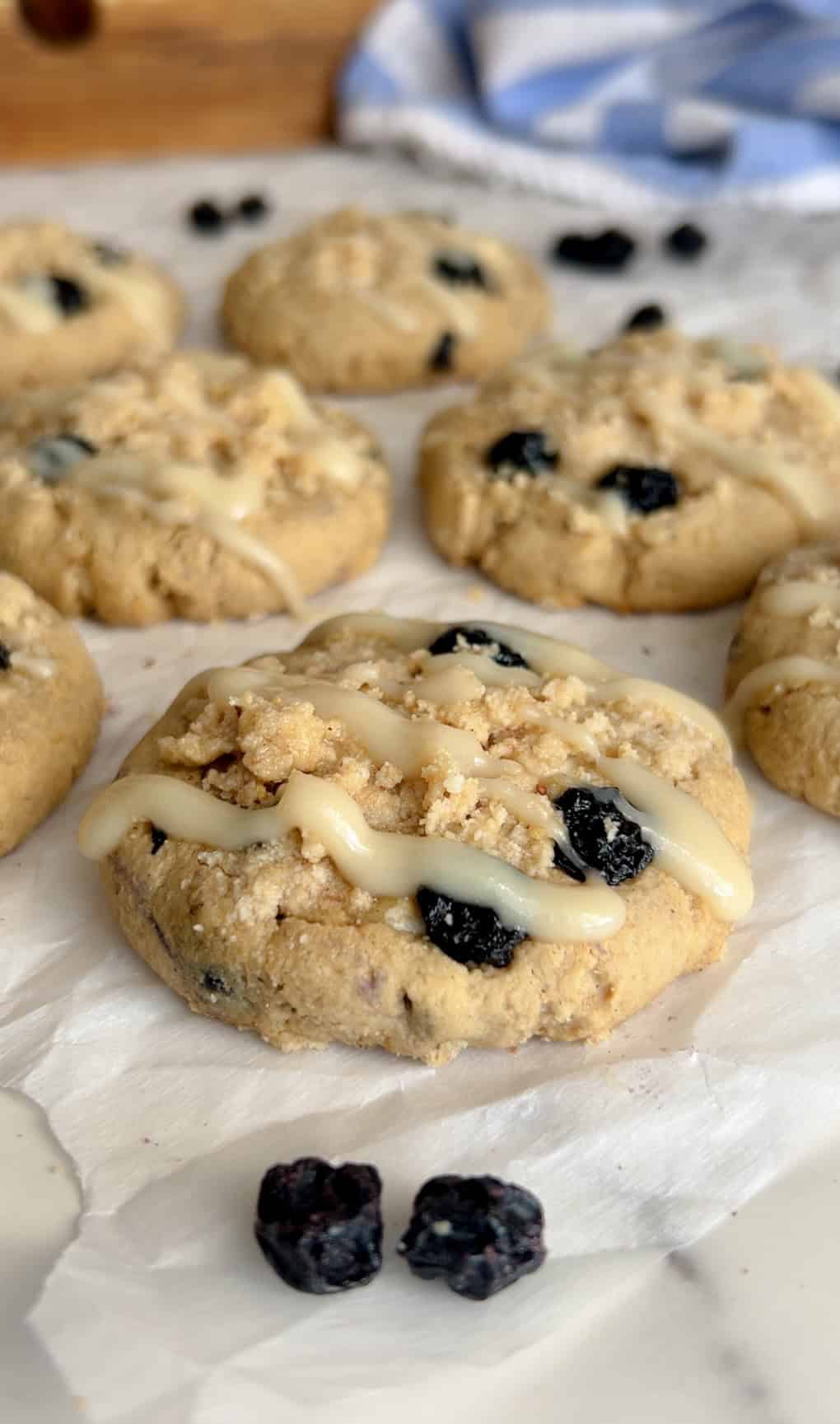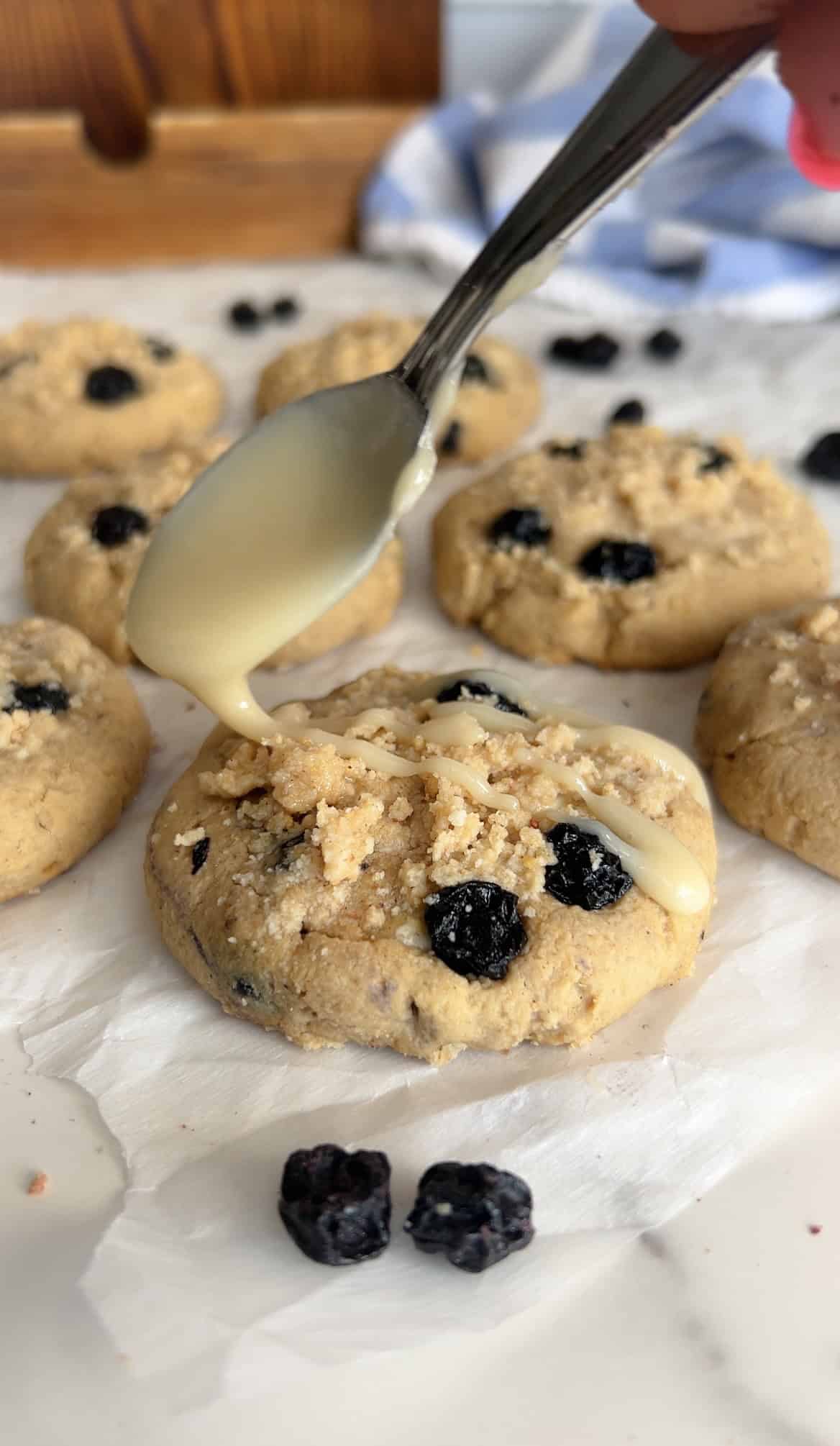 Soft & Chewy Blueberry Muffin Protein Cookies (with Coconut Butter Glaze!)