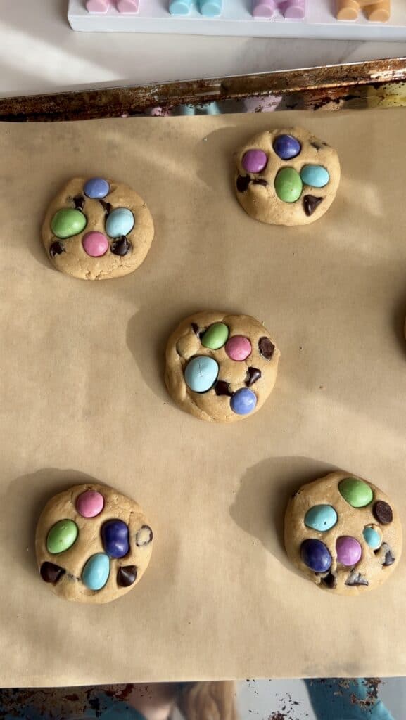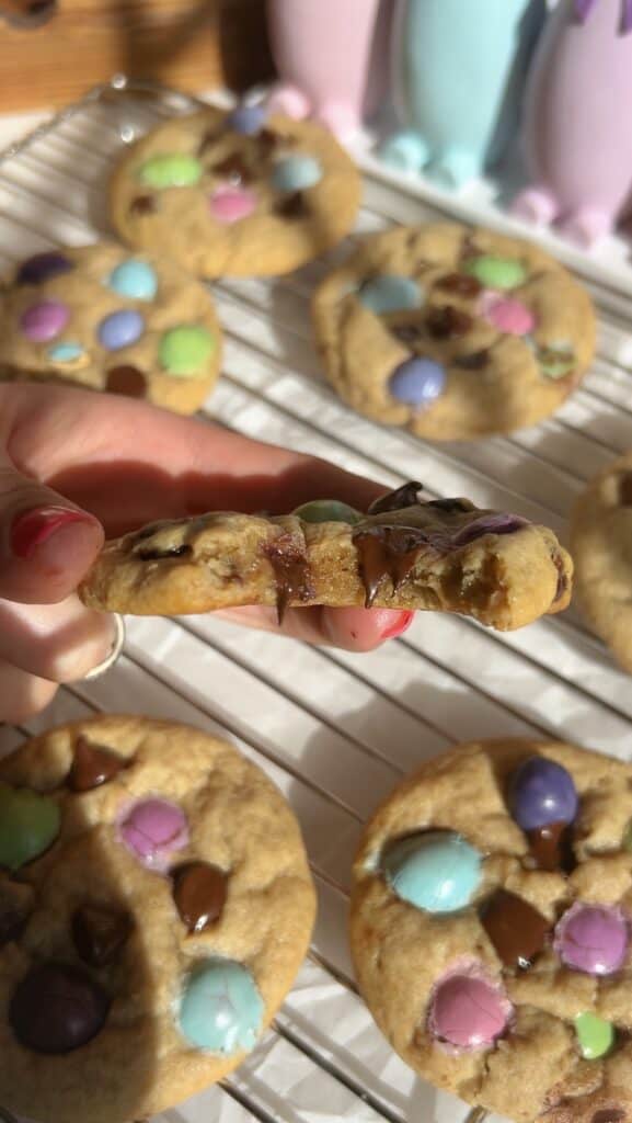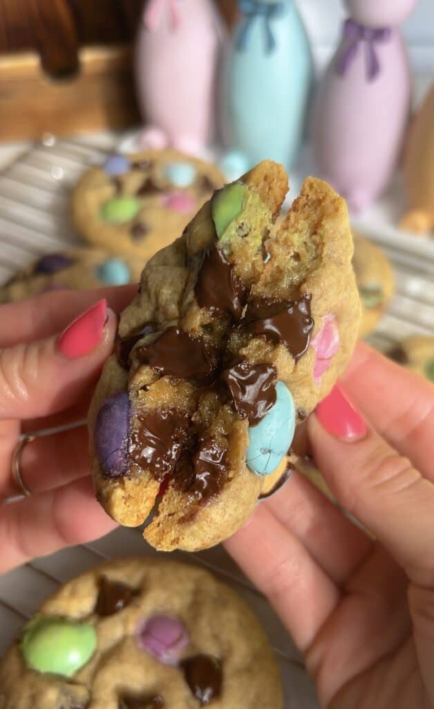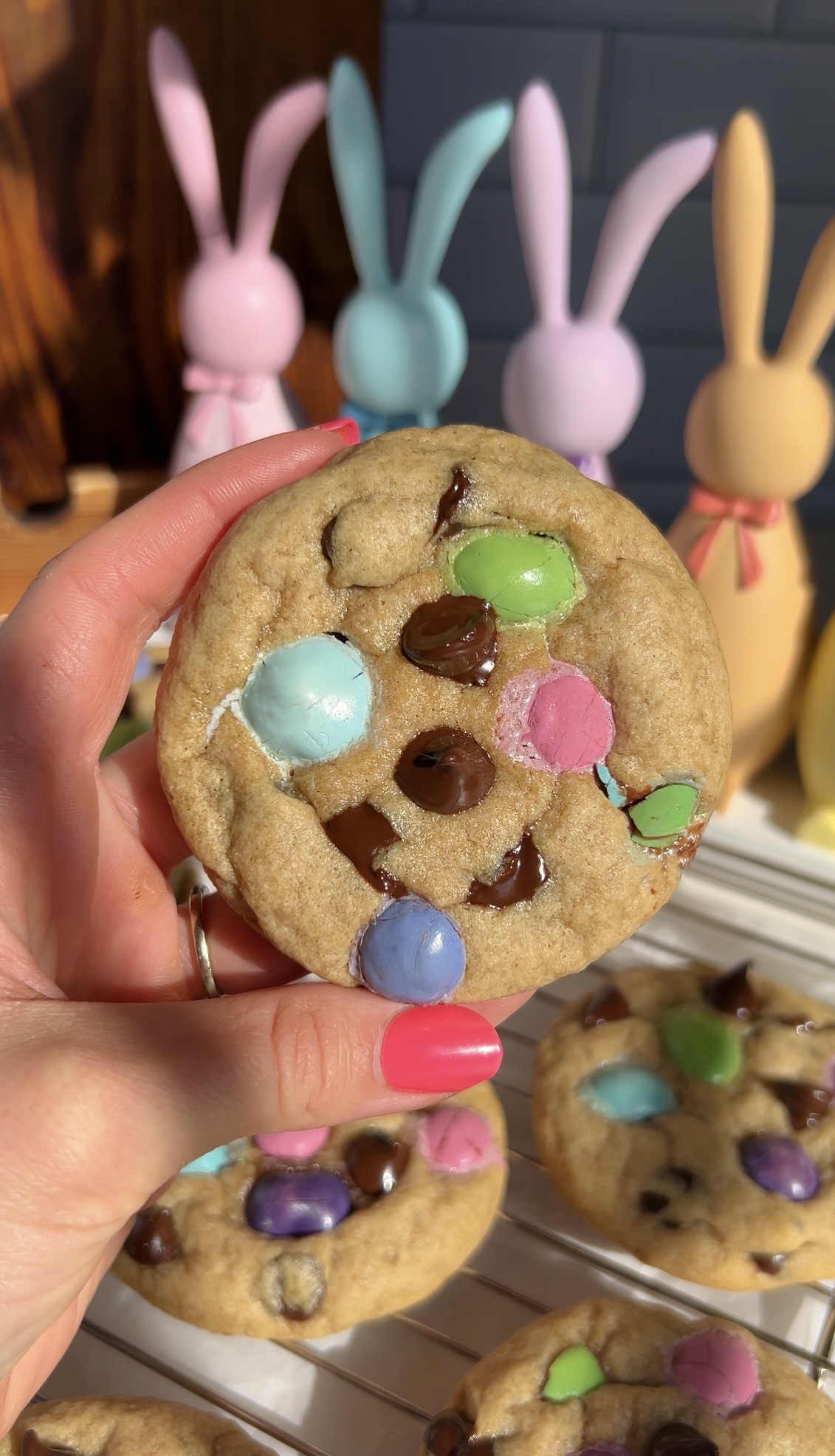 Instead of traditional candy‑coated chocolates, this Easter version uses Lily’s dye‑free chocolate gems for a naturally pastel, spring‑inspired look — think healthier Cadbury eggs baked right into a soft, chewy cookie.