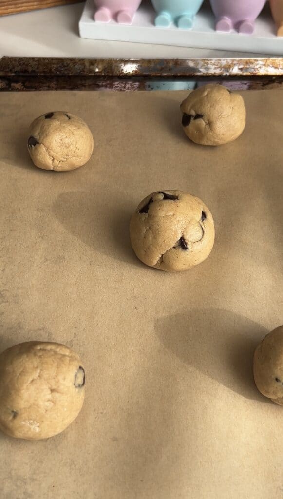 - Use a 2 tbsp cookie scoop to scoop your dough onto parchment paper. Alternatively, spray your hands with coconut oil spray and roll into 2 tbsp dough balls
