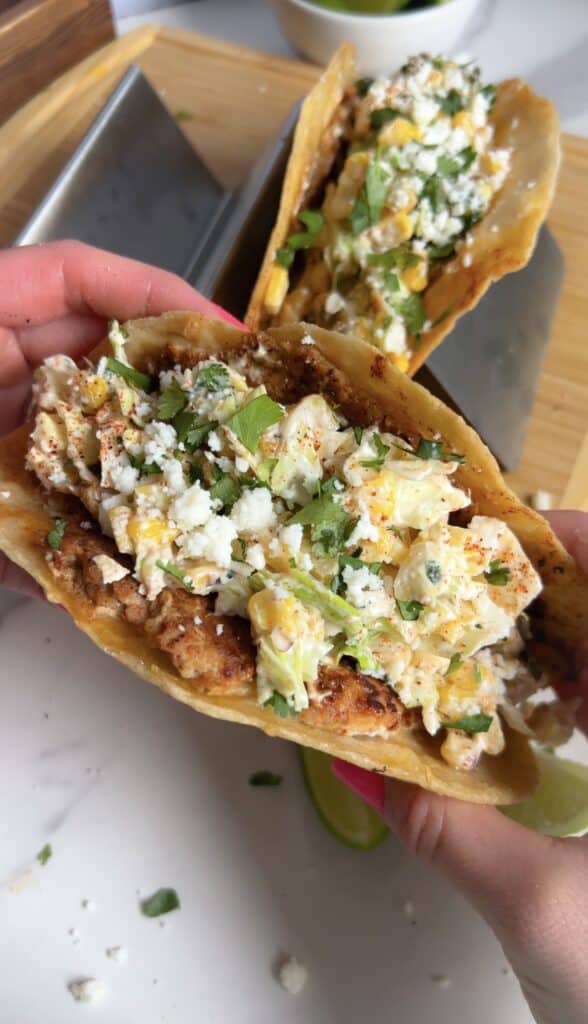 With charred corn, tangy lime, and a lightened‑up cotija yogurt slaw, this recipe brings all the flavors of Mexican street corn into a fresh, family‑friendly dinner that’s easy enough for weeknights and fun enough for entertaining.