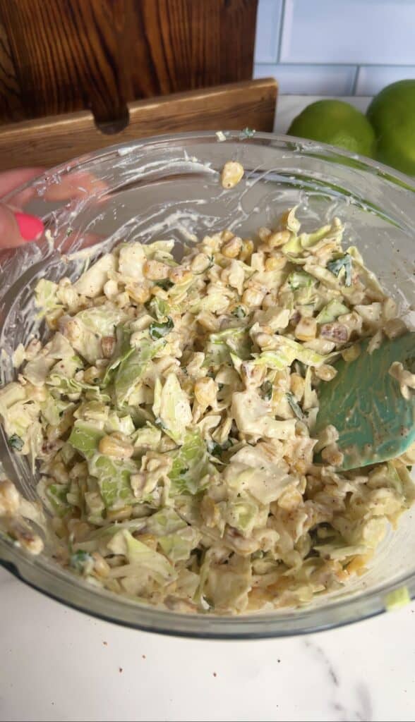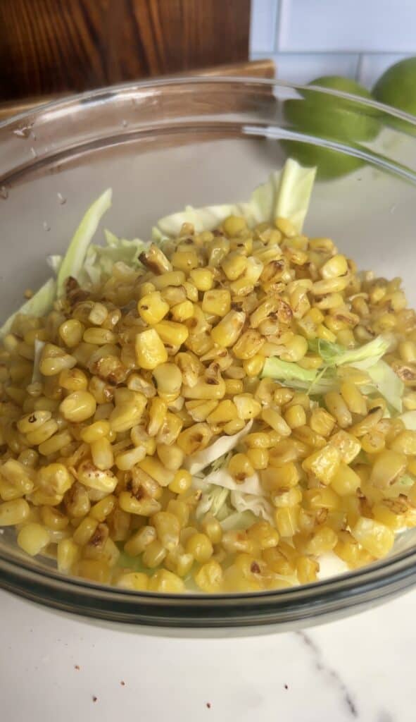- In a bowl, combine cabbage, charred corn, yogurt, mayo (if using), lime juice, cilantro, cotija, smoked paprika/Tajín, and salt.