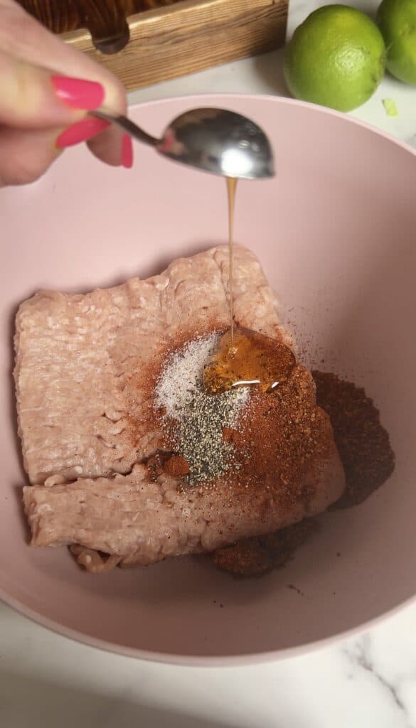 - In a bowl, mix ground chicken with chili‑lime seasoning, smoked paprika, honey, salt, and pepper.