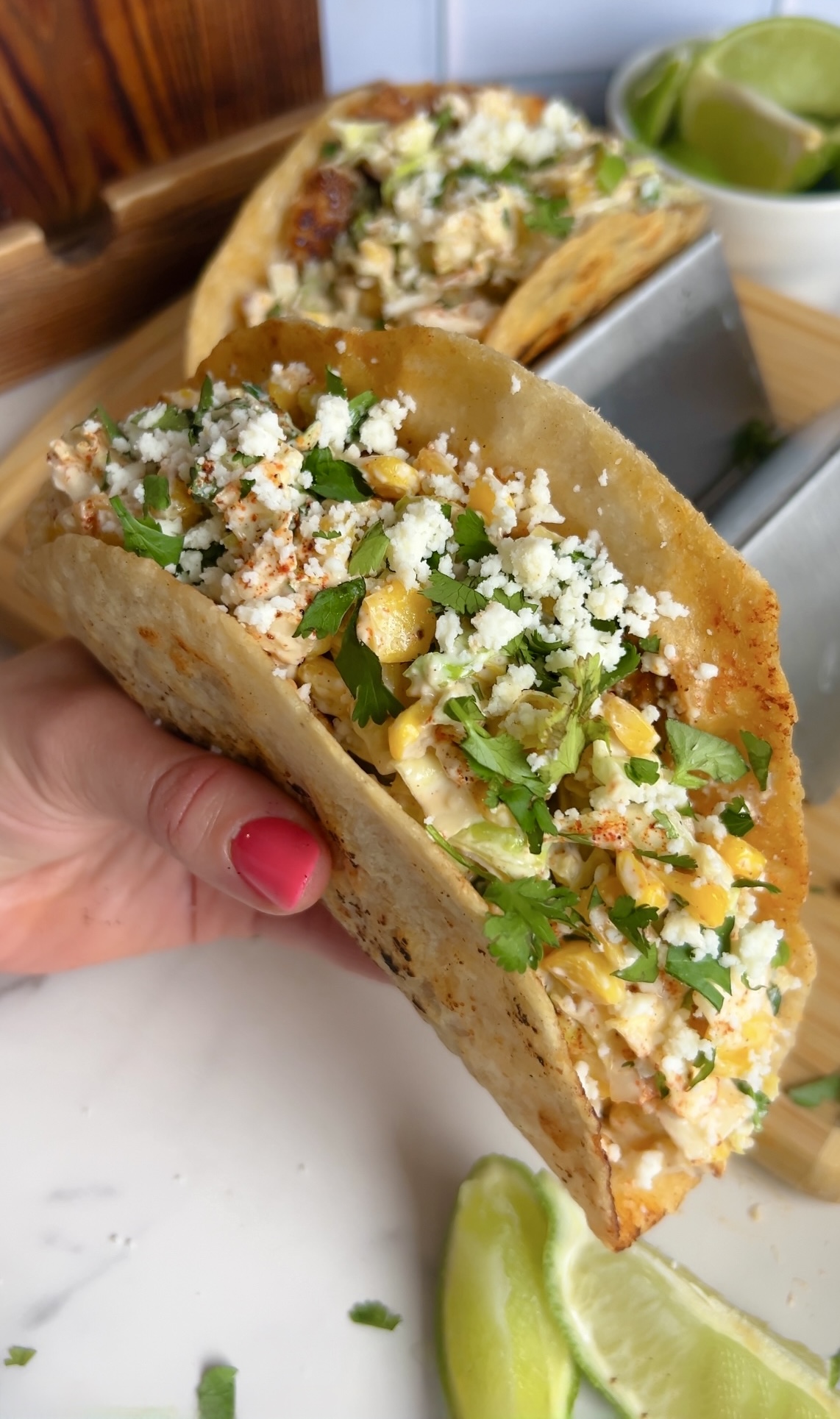 These Street Corn Chicken Smash Tacos take everything you love about classic elote—sweet charred corn, creamy lime dressing, chili heat, and salty cotija—and layer it over a crispy chili‑lime chicken base smashed right into a warm tortilla.