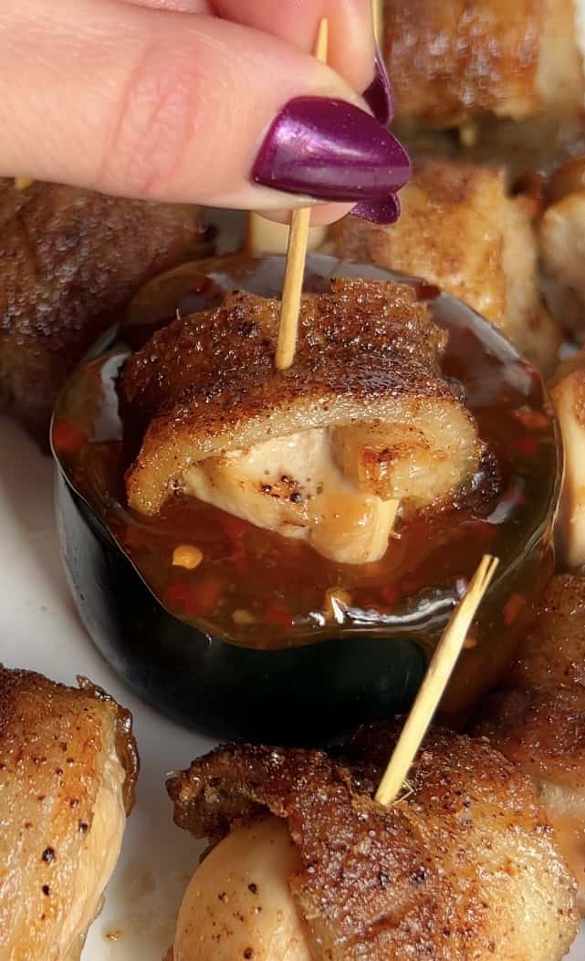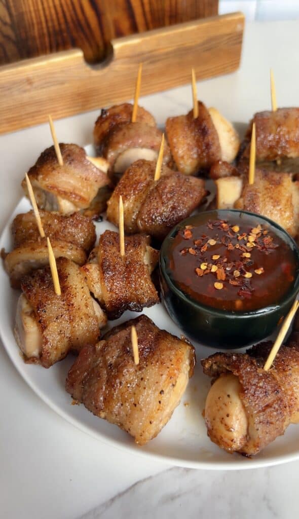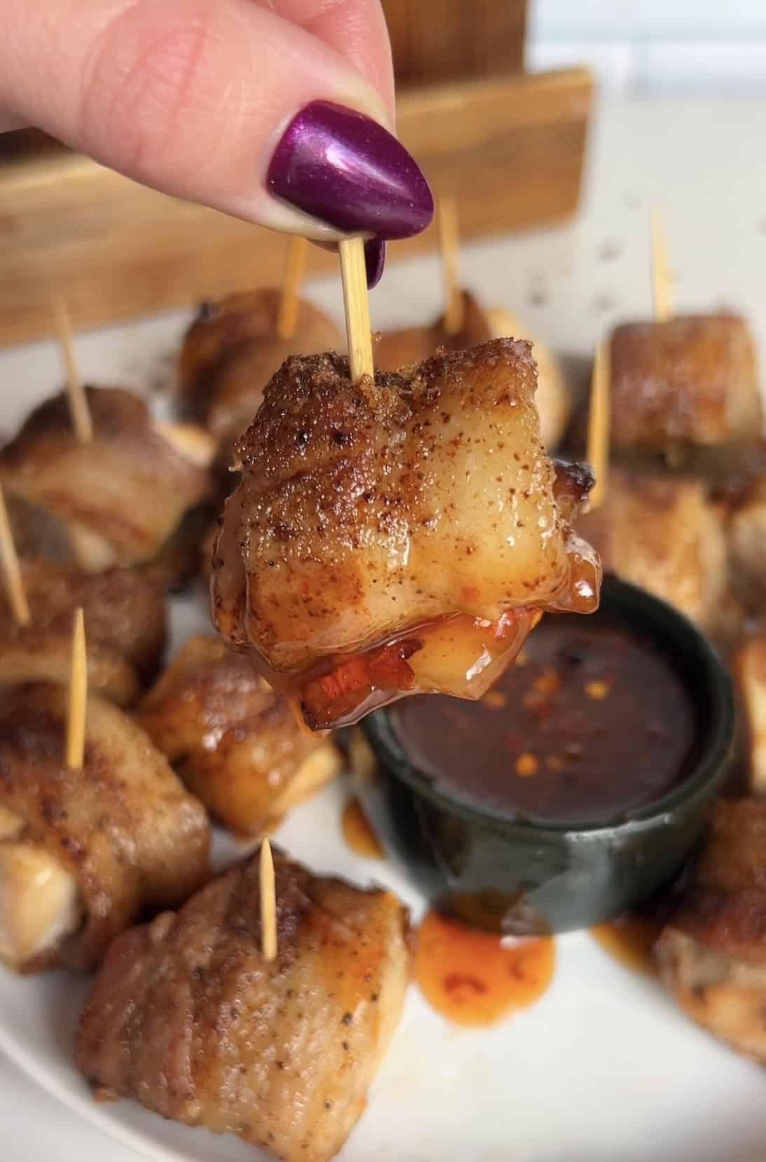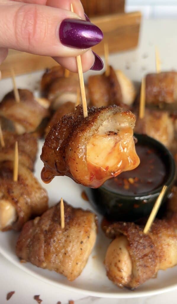 Sweet & Savory Bacon Wrapped Chicken Bites with Homemade Sweet Chili Sauce