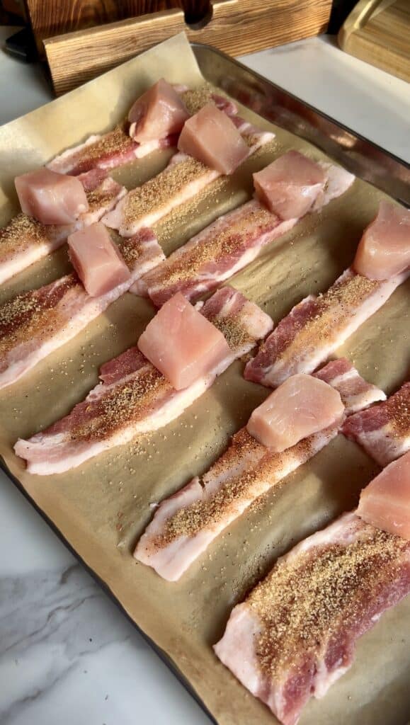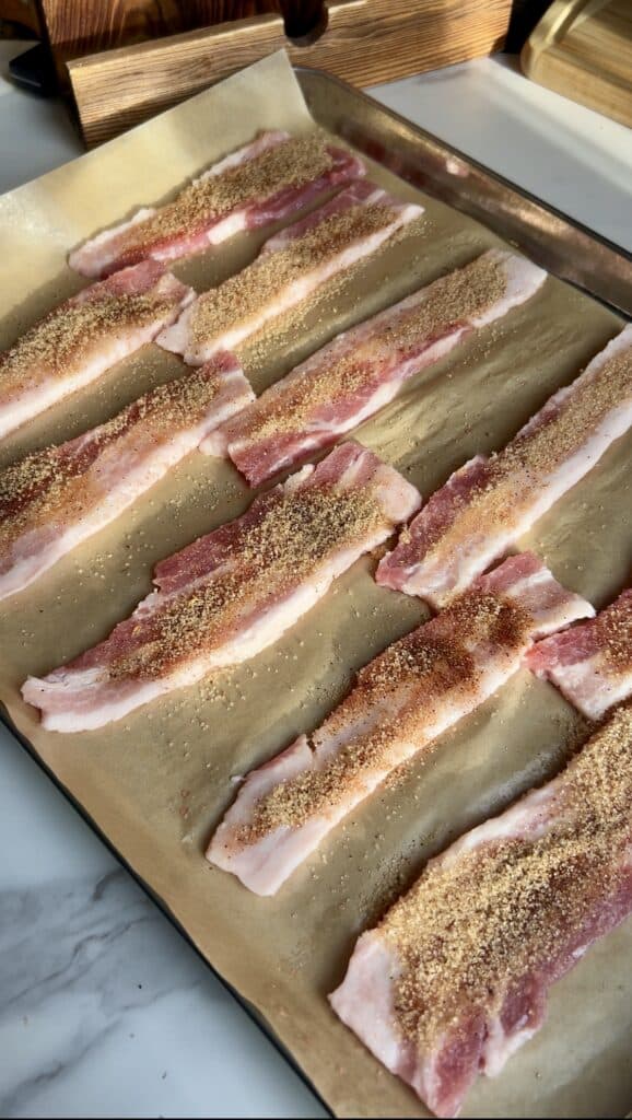 - Slice your thick cut bacon in half and line on a baking tray lined with parchment paper