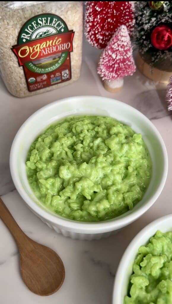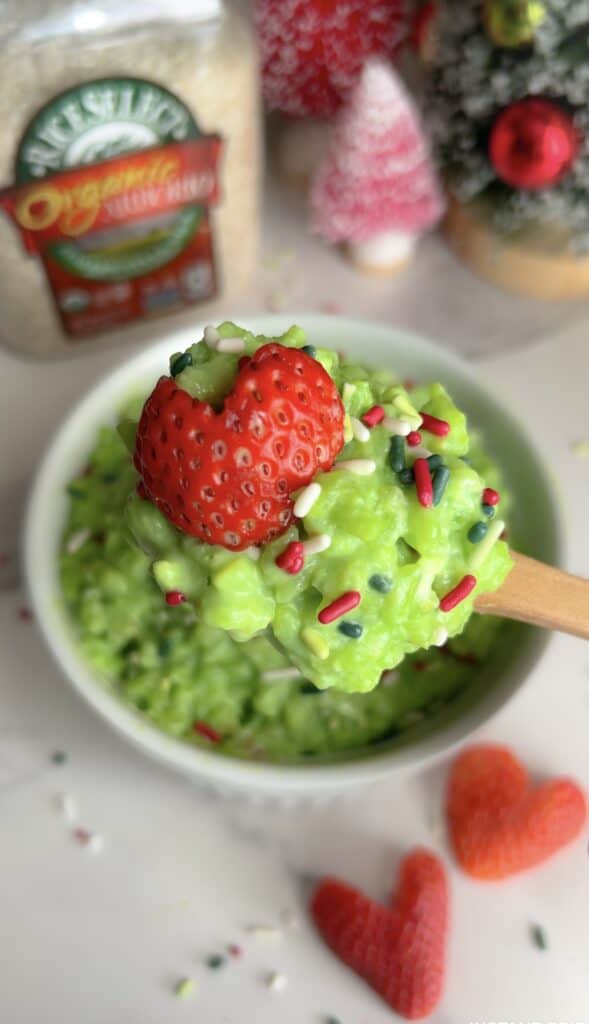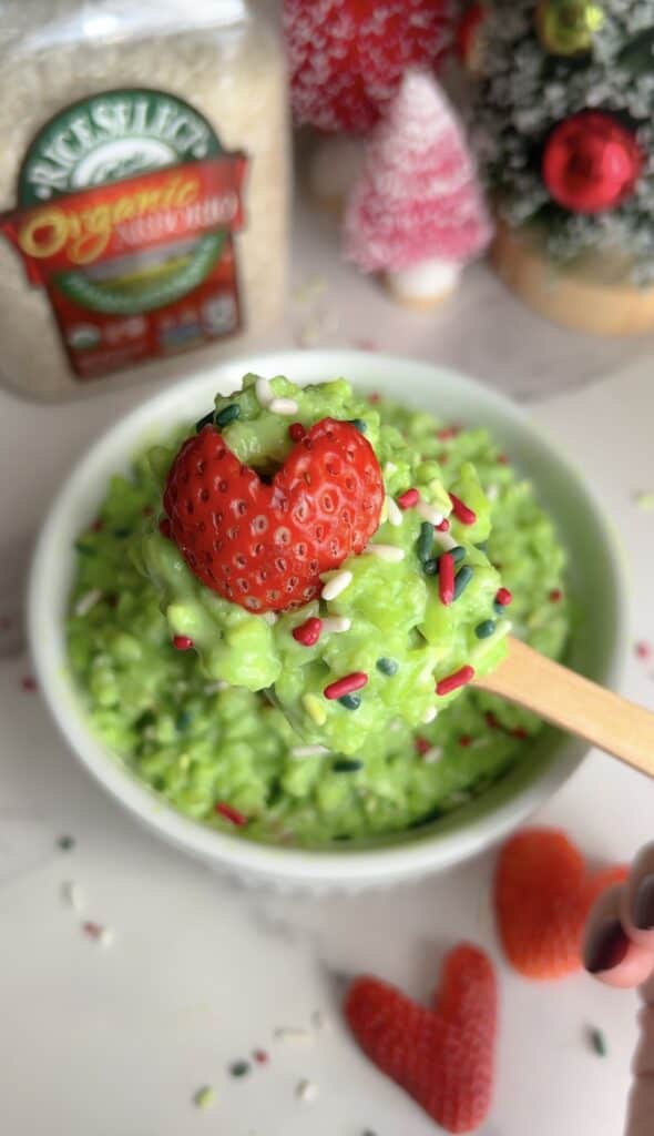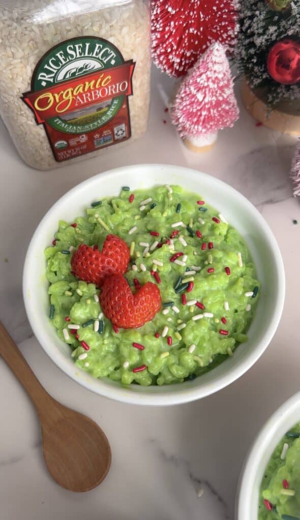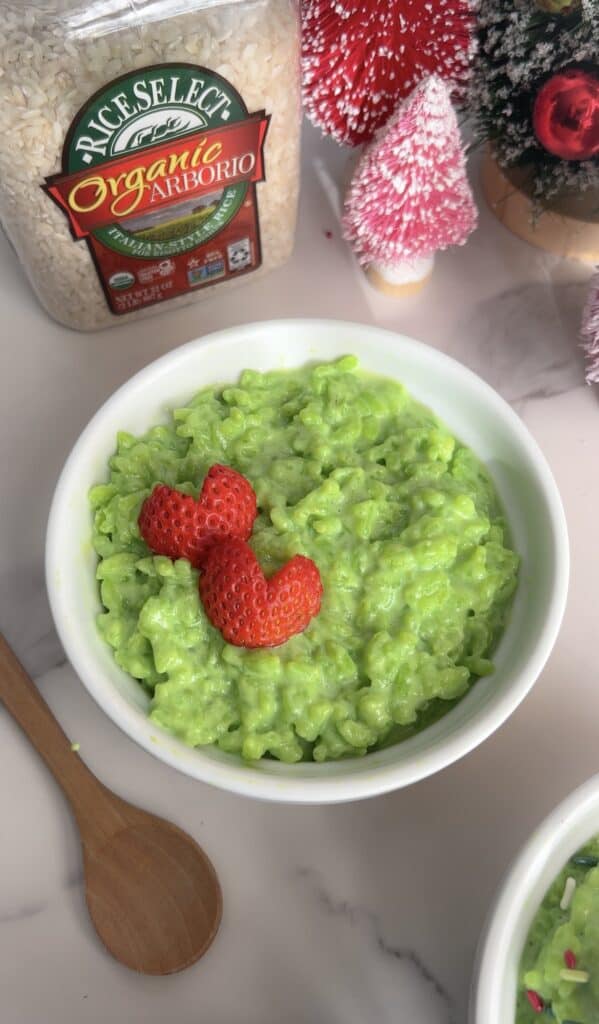 The The Grinch Rice Pudding or sugar cookie flavored rice pudding is nourishing and as pretty as it looks, is made with no artificial dyes!