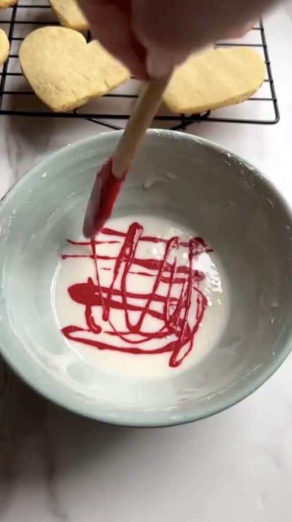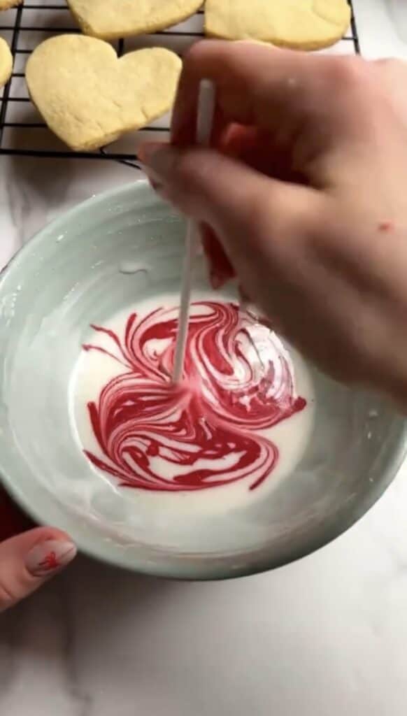 - In a bowl add your plain icing, then drizzle red. Swirl together with a toothpick lightly