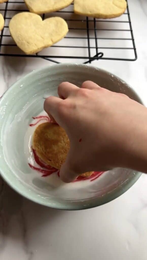 - Dip sugar cookie in icing, then lift straight up and allow excess to drip off for 10-15 seconds